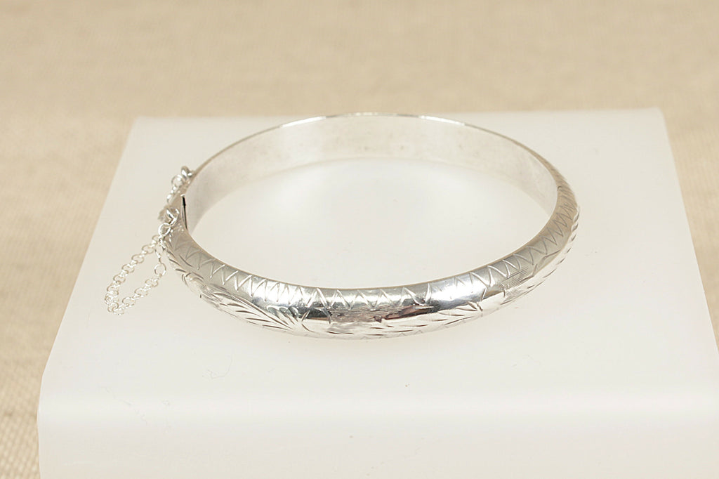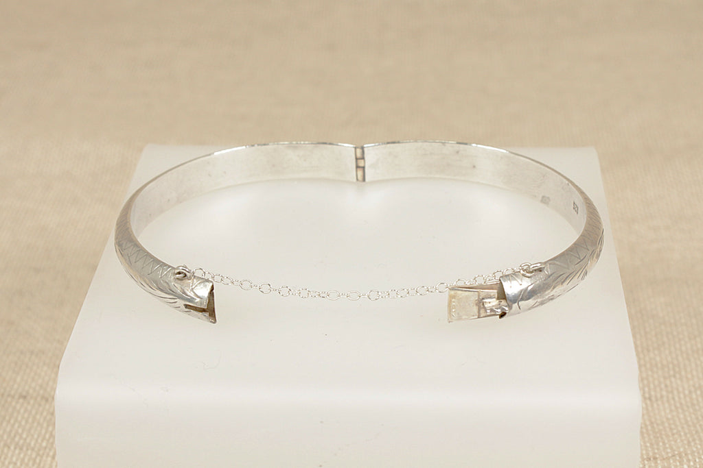 This pretty Vintage Silver hinged bangle features an attractive combination of floral and geometric etched designs that decorate the entire band, giving it a beautifully detailed and timeless look. It is fitted with a secure hinge and clasp, complemented by a safety chain for added peace of mind. Inside the band, the bangle is stamped 925, confirming its sterling silver quality.