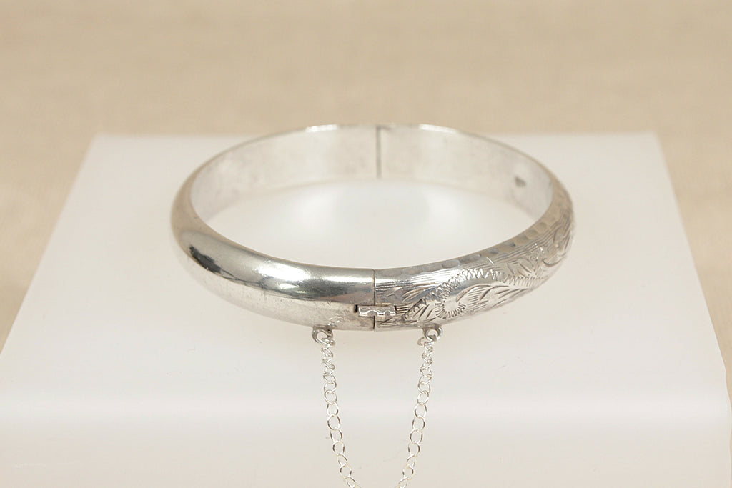 This timeless Vintage Silver bangle features a crisp hinge and secure safety chain, ensuring comfortable and confident wear. The design includes elegant floral-inspired etching across half of the band, complemented by a subtle planished (hammered) effect along the edges for added texture and character.