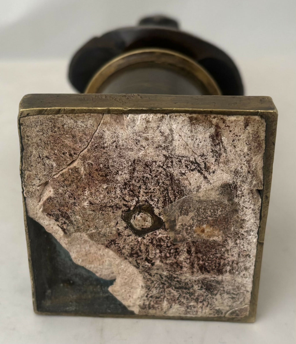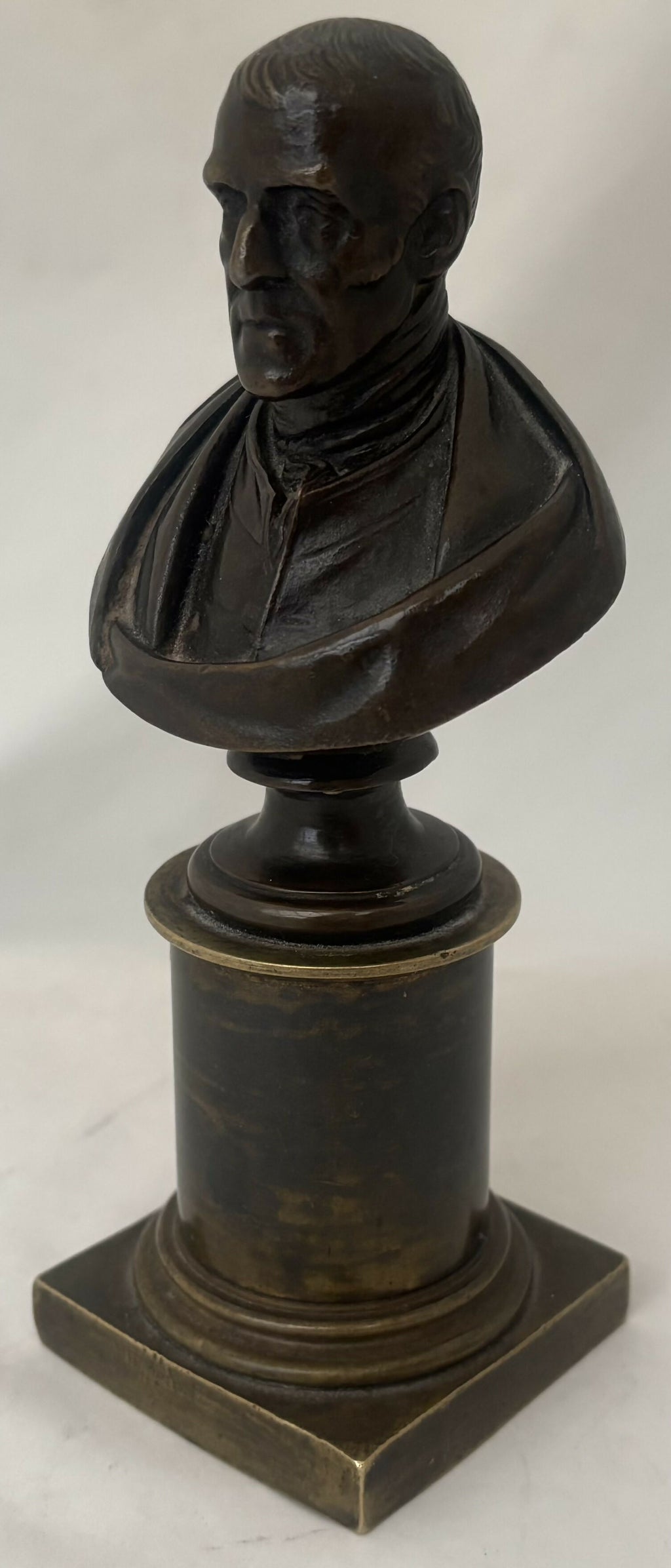 In good patinated condition. The base covering and some of the base filler missing, as per the photo. The cylindrical and square base are brass, while the bust is bronze.