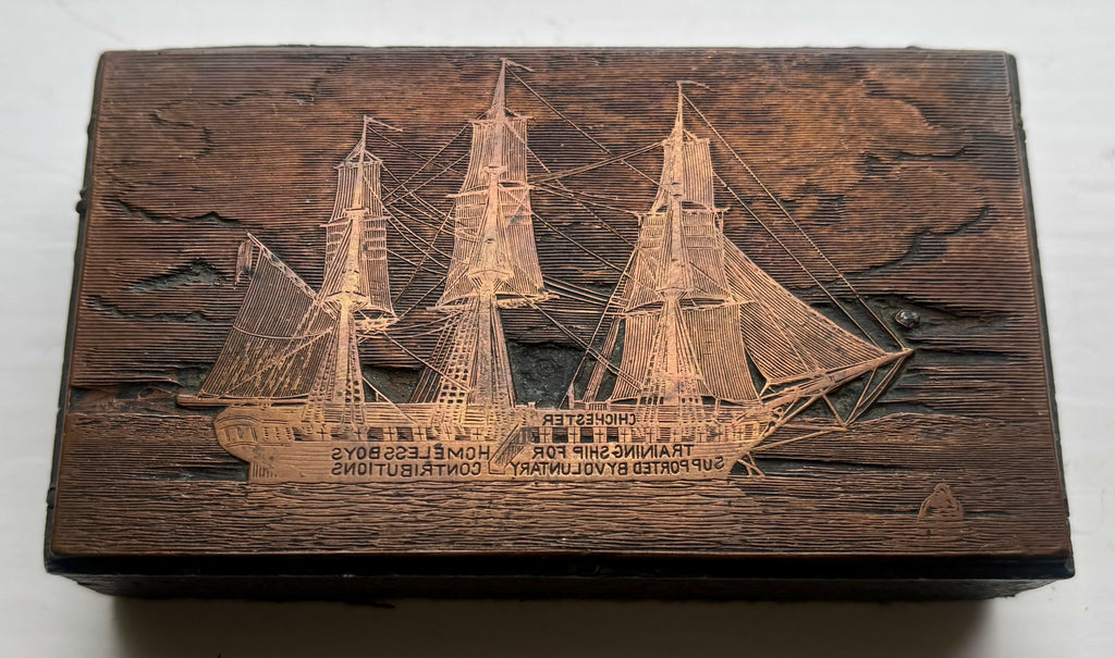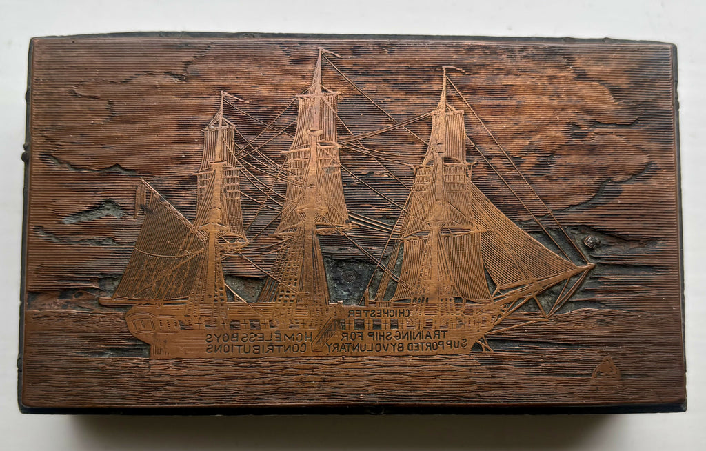 HMS Chichester was a 52 gun, fourth rate, ship of the line launched in 1843. In 1866 the ship was loaned to Lord Shaftesbury to train destitute boys from London for a career at sea. HMS Chichester had large lettering on her hull: 'Chichester Training Ship for Homeless Boys Supported by Voluntary Contributions' and this is shown on the printing block. She was Moored on the River Thames at Greenhithe and sold off in 1889.