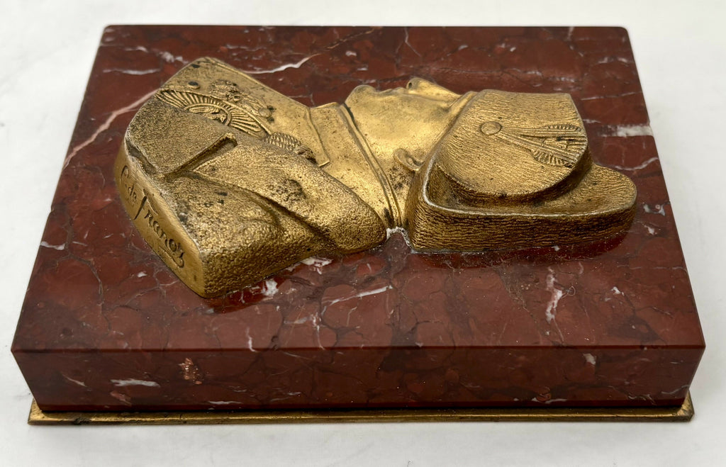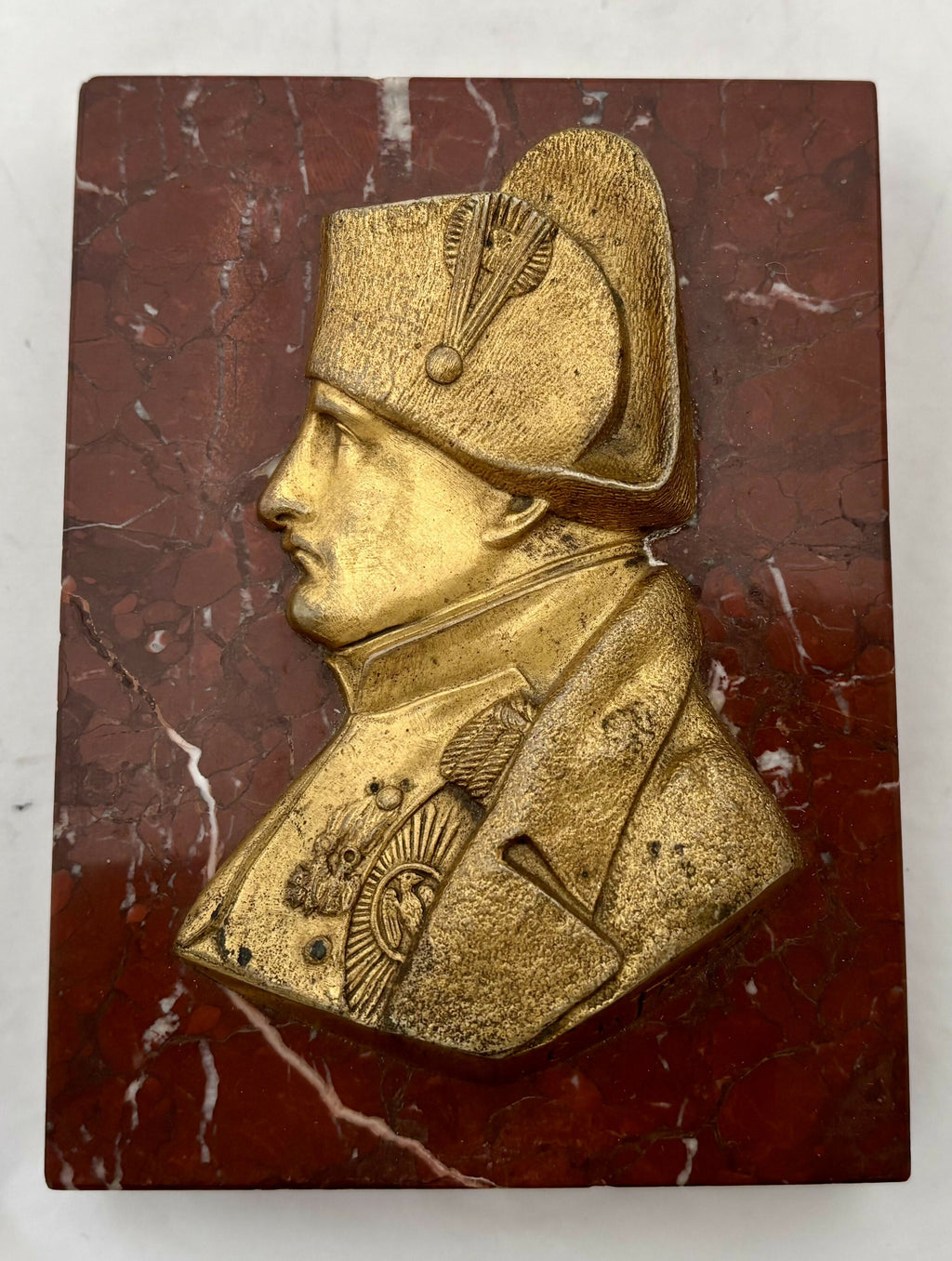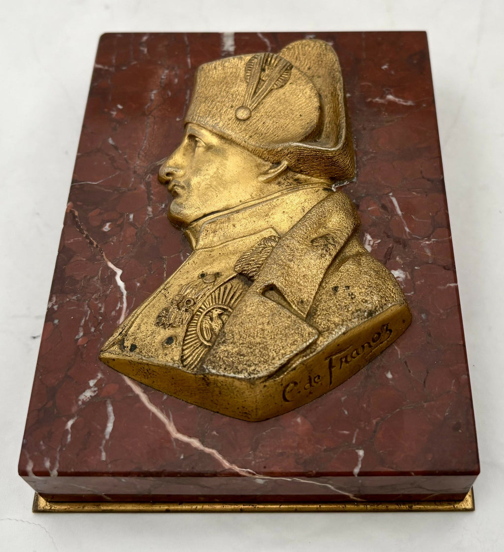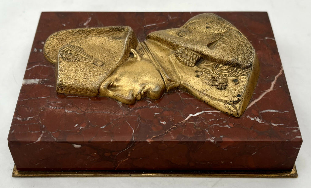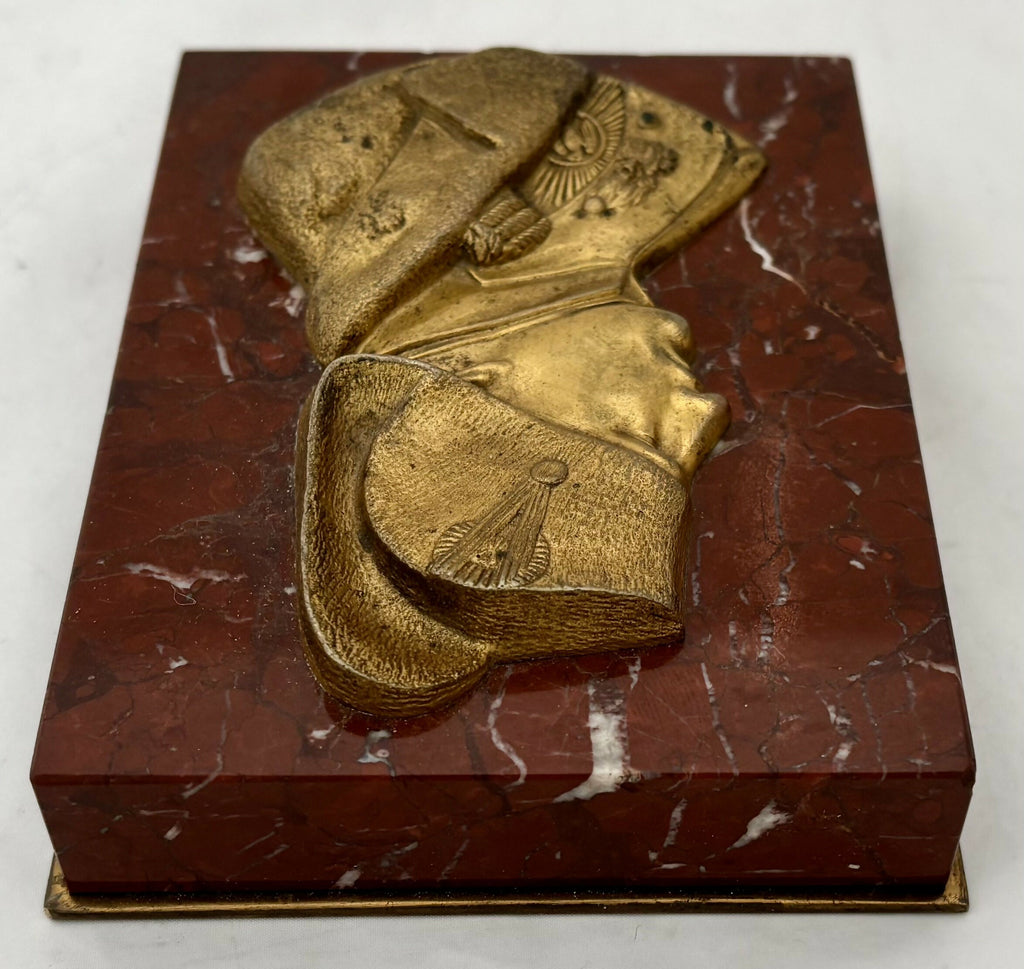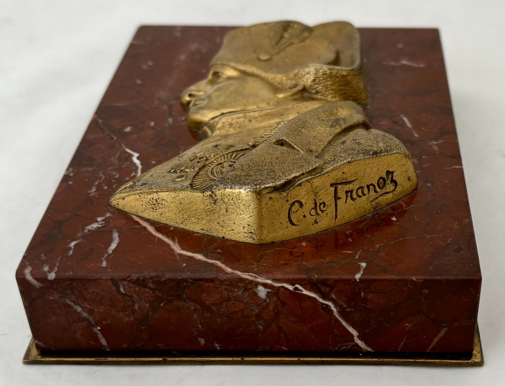 Napoleon Bonaparte Gilt Metal Bust Applied to a Red Marble Desk Paperweight on a Brass Base Plinth. After François-Charles de Franoz. Early 20th Century.
