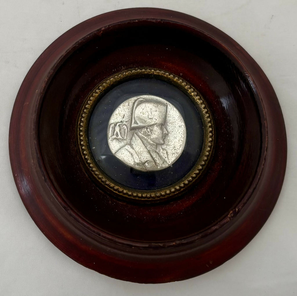 Napoleon Bonaparte, A 19th Century Silver Coloured Portrait Medallion Housed within a Wooden Roundel and Mounted on a Blue Velvet Backing.