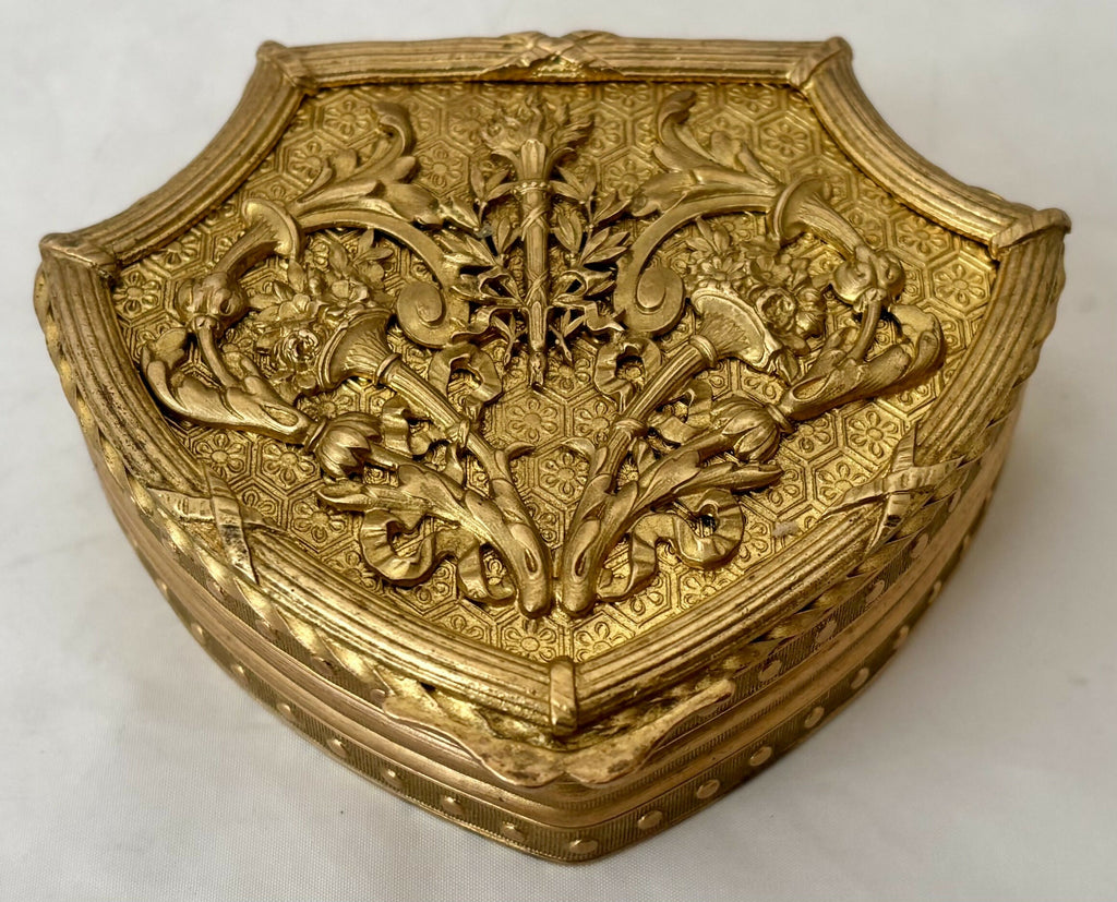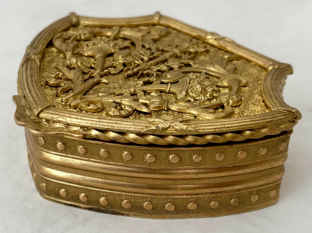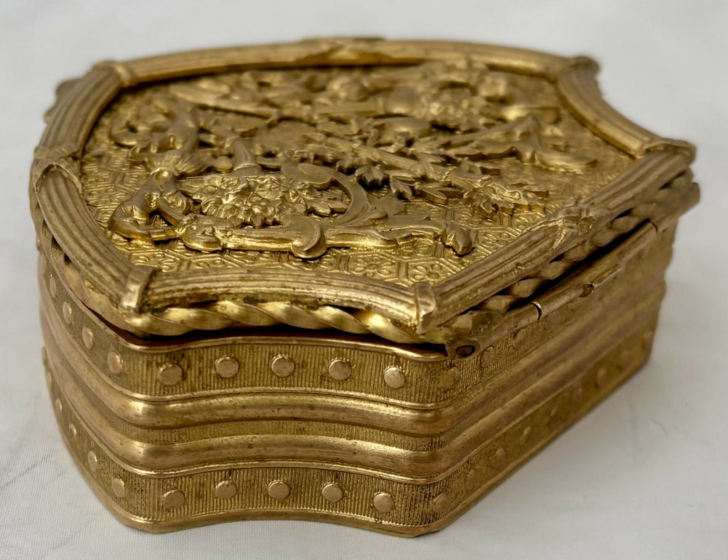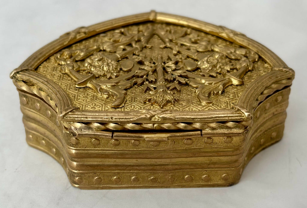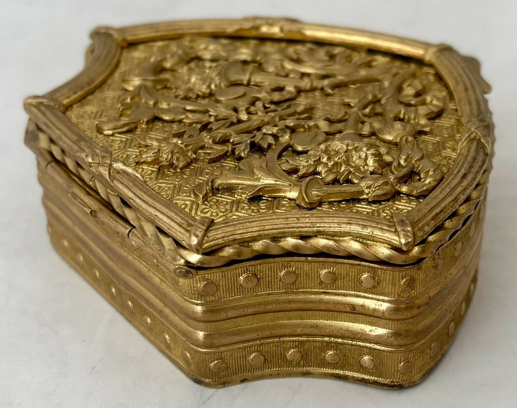 Ornate Continental Gilt Metal Jewel Casket, circa 1900. The cover with a ribbon and reeded border and the sides with a rivet effect, either side of banding. The cover with applied scrolling foliage. The interior is of faded velvet.
