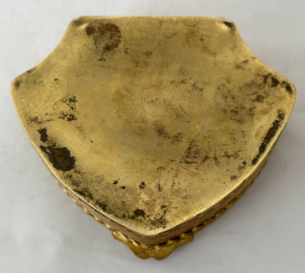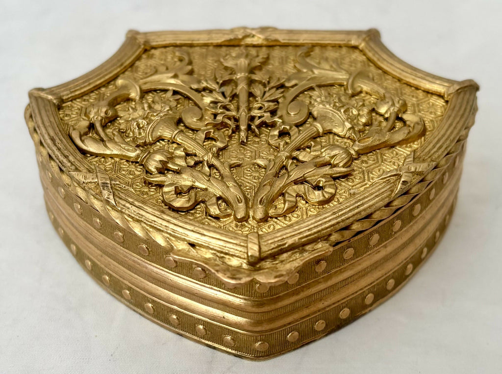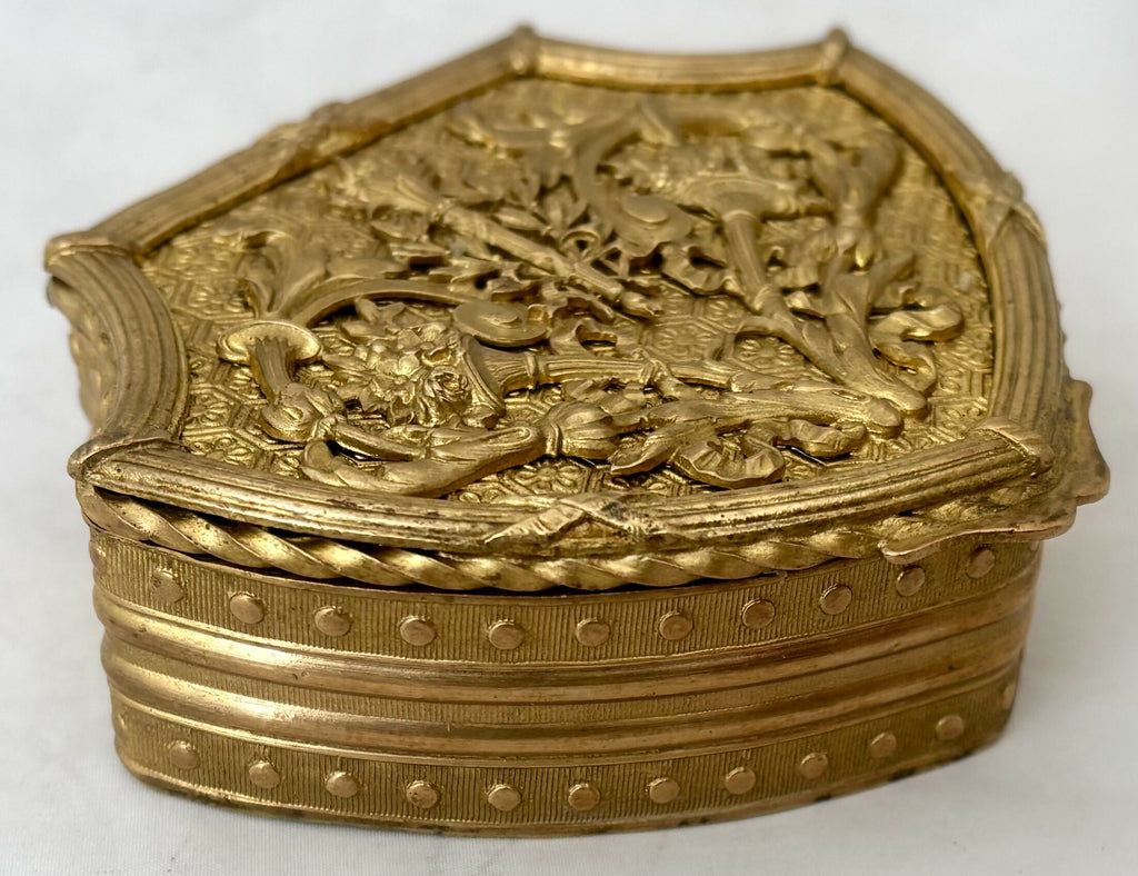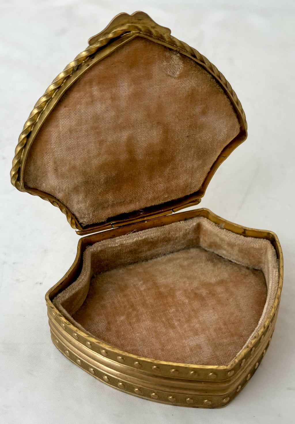 Ornate Continental Gilt Metal Jewel Casket, circa 1900. The cover with a ribbon and reeded border and the sides with a rivet effect, either side of banding. The cover with applied scrolling foliage. The interior is of faded velvet.