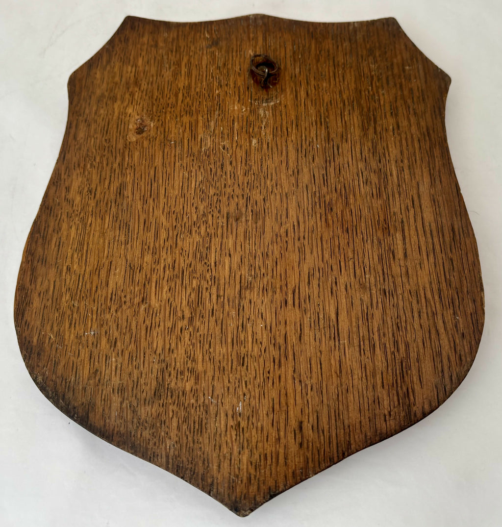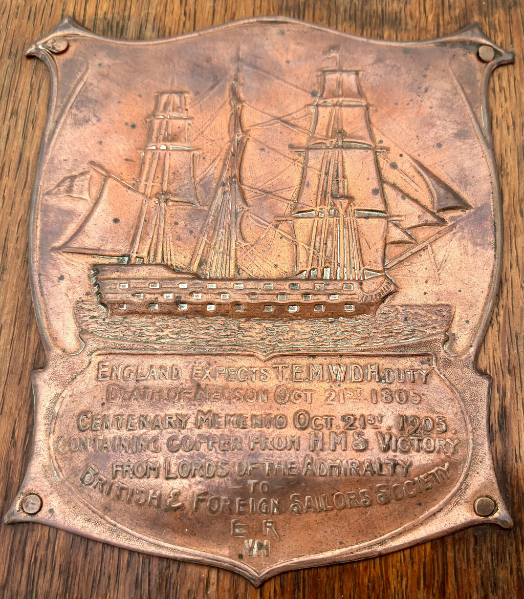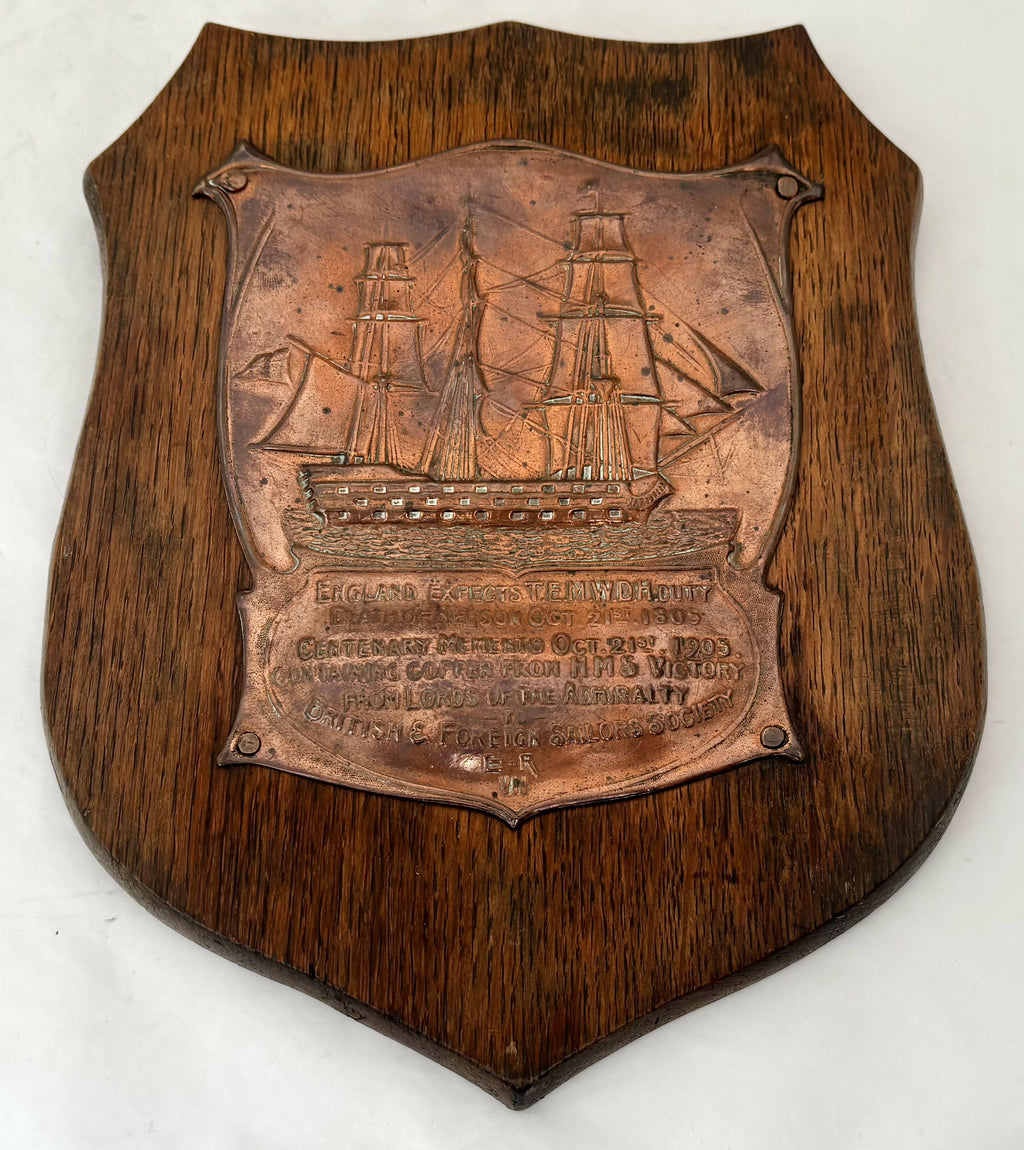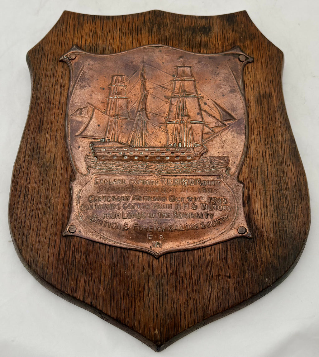 The Death of Vice-Admiral Horatio Nelson, 1st Viscount Nelson, Centenary Plaque, Made with Copper from HMS Victory. The Art Nouveau influenced copper is mounted on a shield shaped oak plaque. It features an image of HMS Victory and the text: