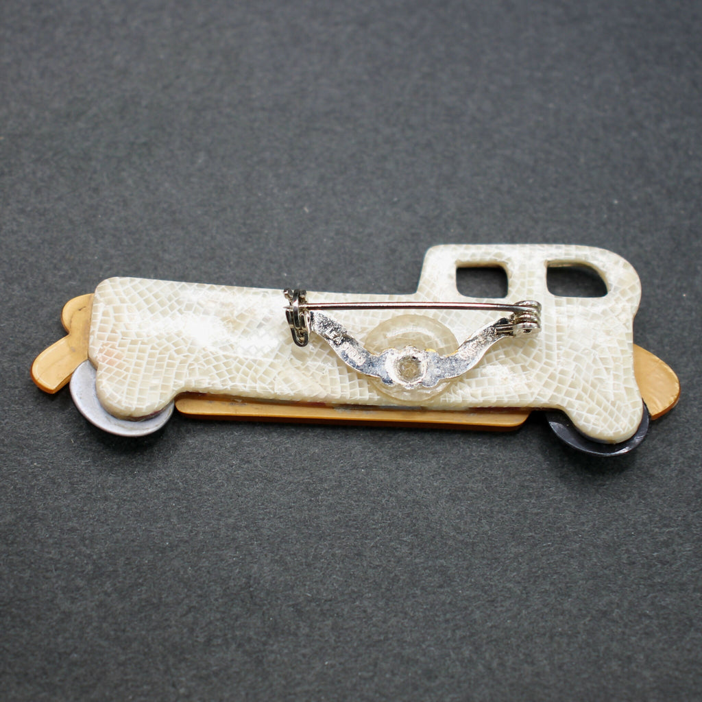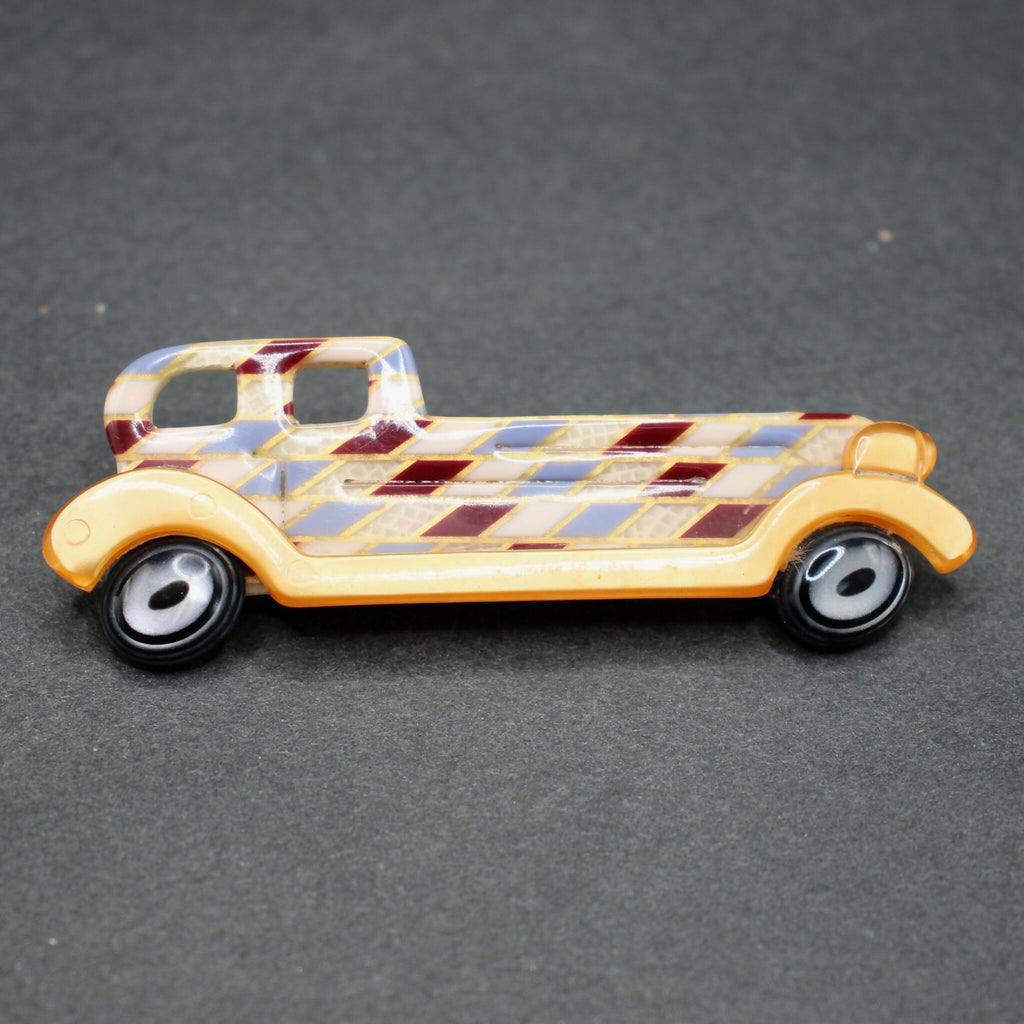 Original Lea Stein limousine brooch measuring approximately 70mm wide by 26mm high. The brooch is moulded in shades of brown and blue, and has the oval “in motion” wheels. The v-shaped brooch pin/mount is stamped “Lea Stein” and “Paris”.