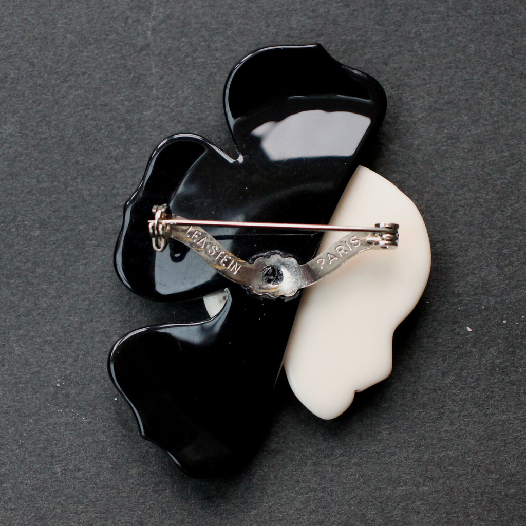 Original black and green Lea Stein “Paris Corolle” brooch measuring approximately 55mm wide by 55mm high. The v-shaped brooch pin/mount is stamped “Lea Stein” and “Paris”.