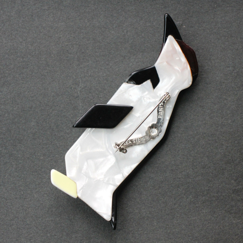 Original Lea Stein “Penguin” brooch measuring approximately 36mm wide by 85mm high. The v-shaped brooch pin/mount is stamped “Lea Stein” and “Paris”.The brooch is pre-owned and in very good condition. It is not boxed.