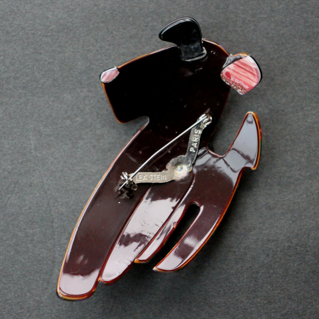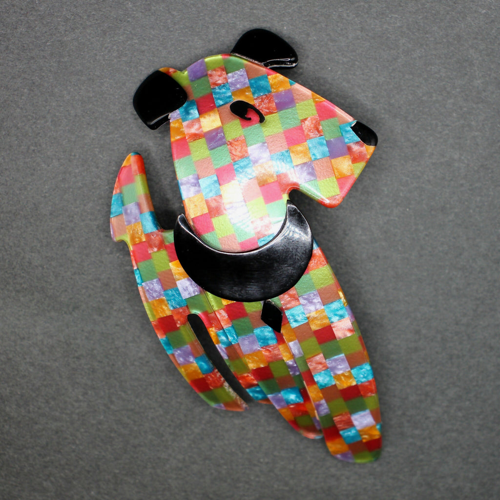 Original multicolour Lea Stein “Ric the terrier” brooch measuring approximately 55mm wide by 85mm high. The v-shaped brooch pin/mount is stamped “Lea Stein” and “Paris”.