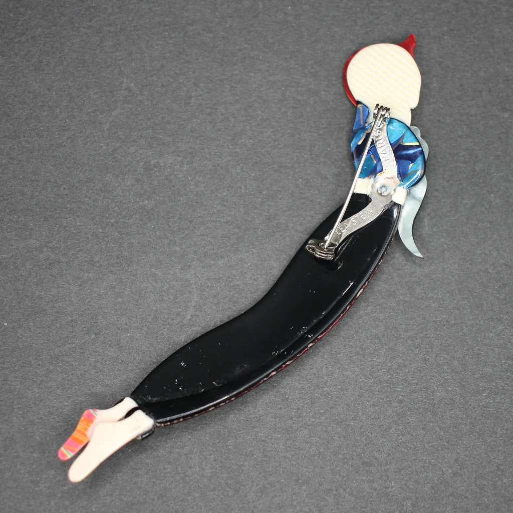 Original Lea Stein “Tennis player” brooch measuring approximately 20mm wide by 115mm high. The v-shaped brooch pin/mount is stamped “Lea Stein” and “Paris”.