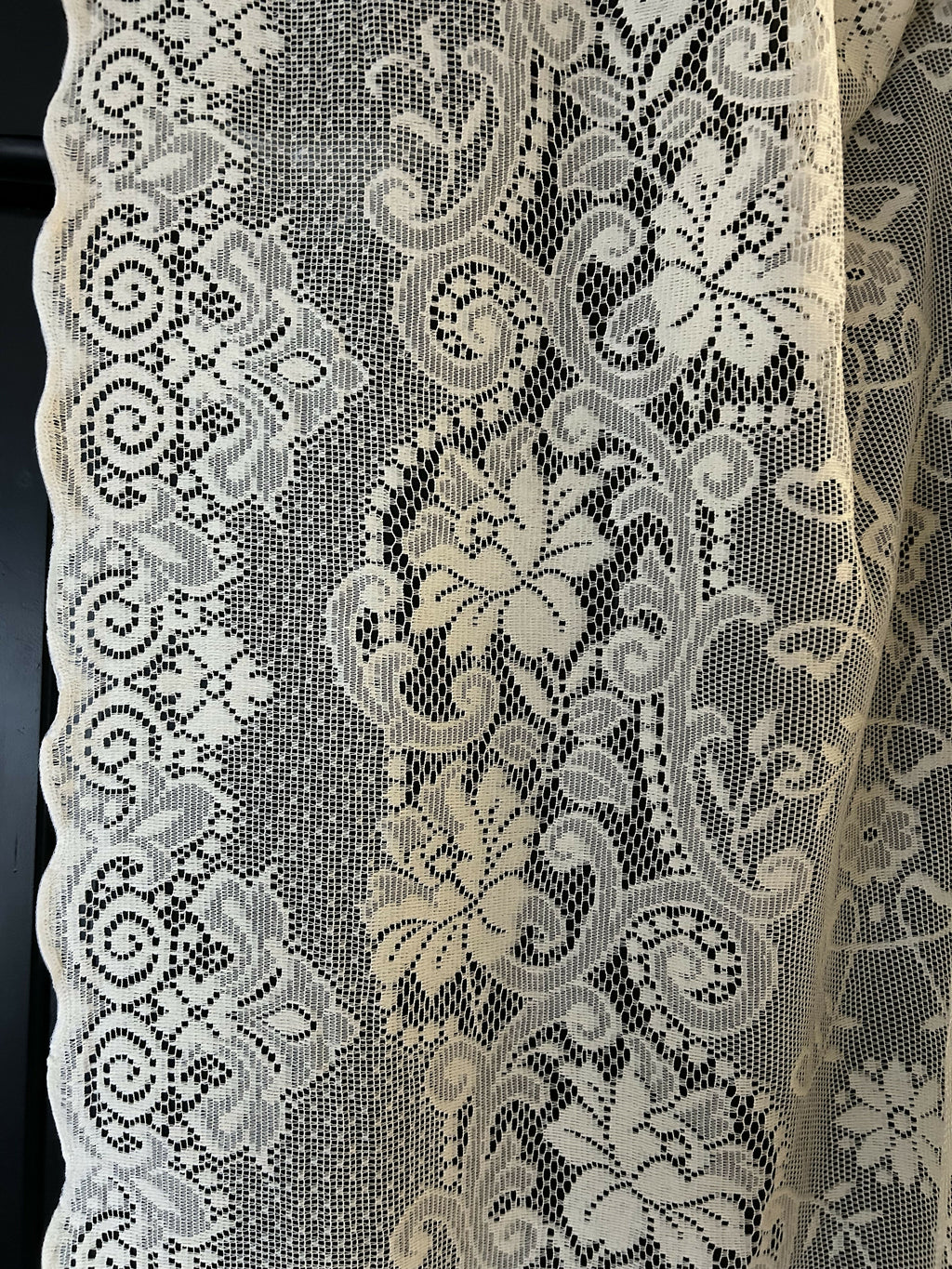 It has a fine cotton weave with delicate scalloped edges to the sides. This is an unfinished panel length, so it will need hemming at the top and bottom.