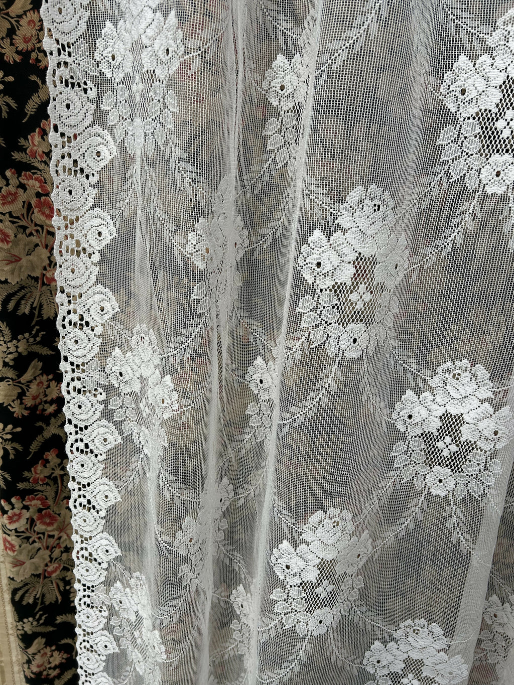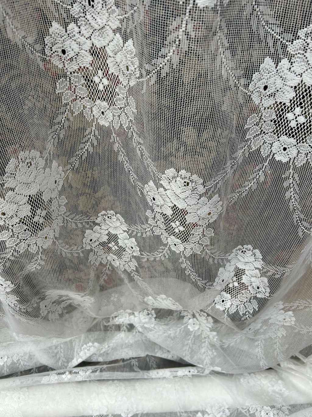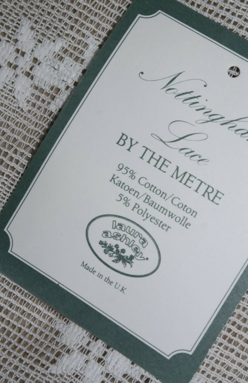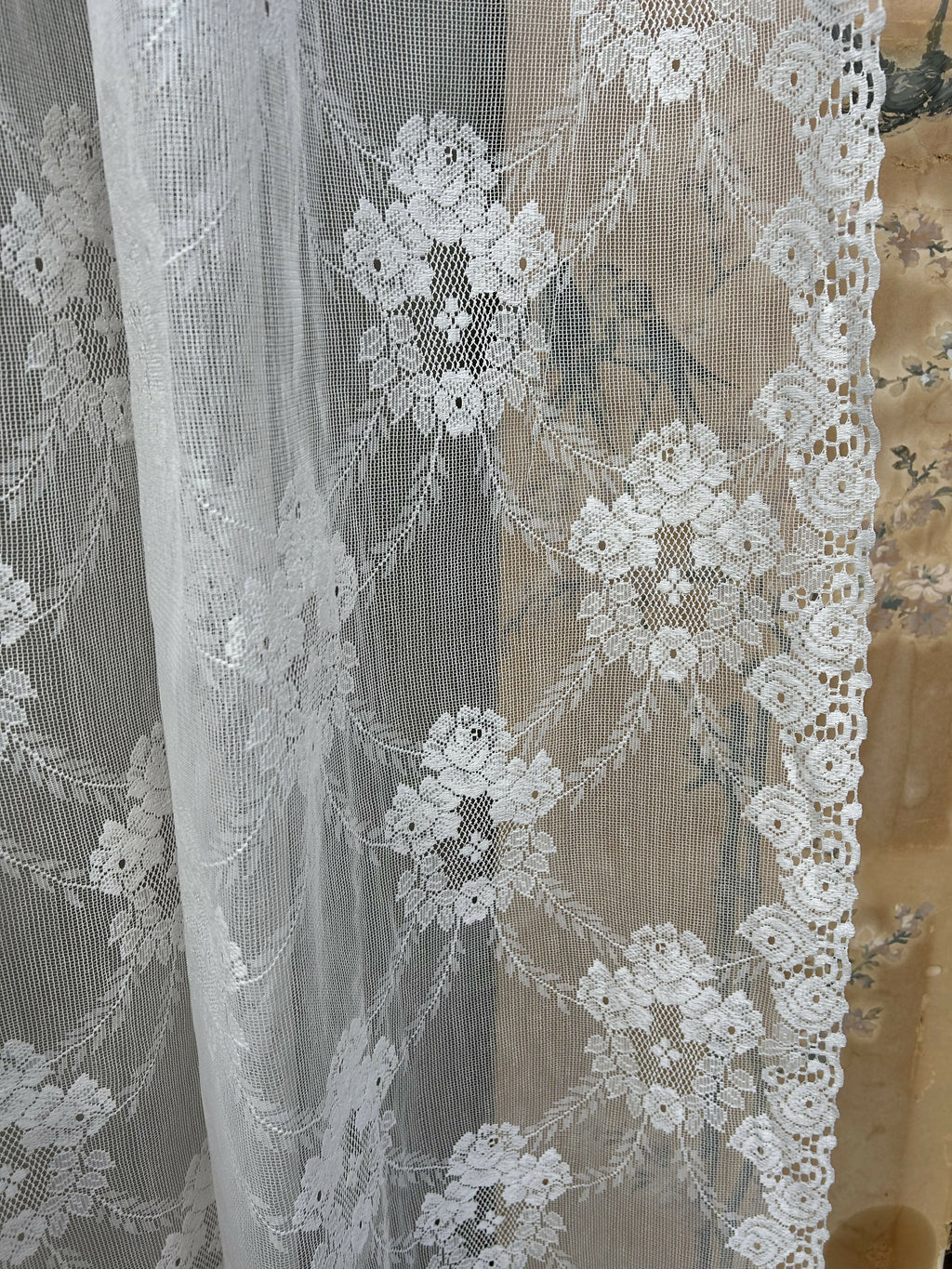 White in colour with original period styling decorating this lace curtaining.