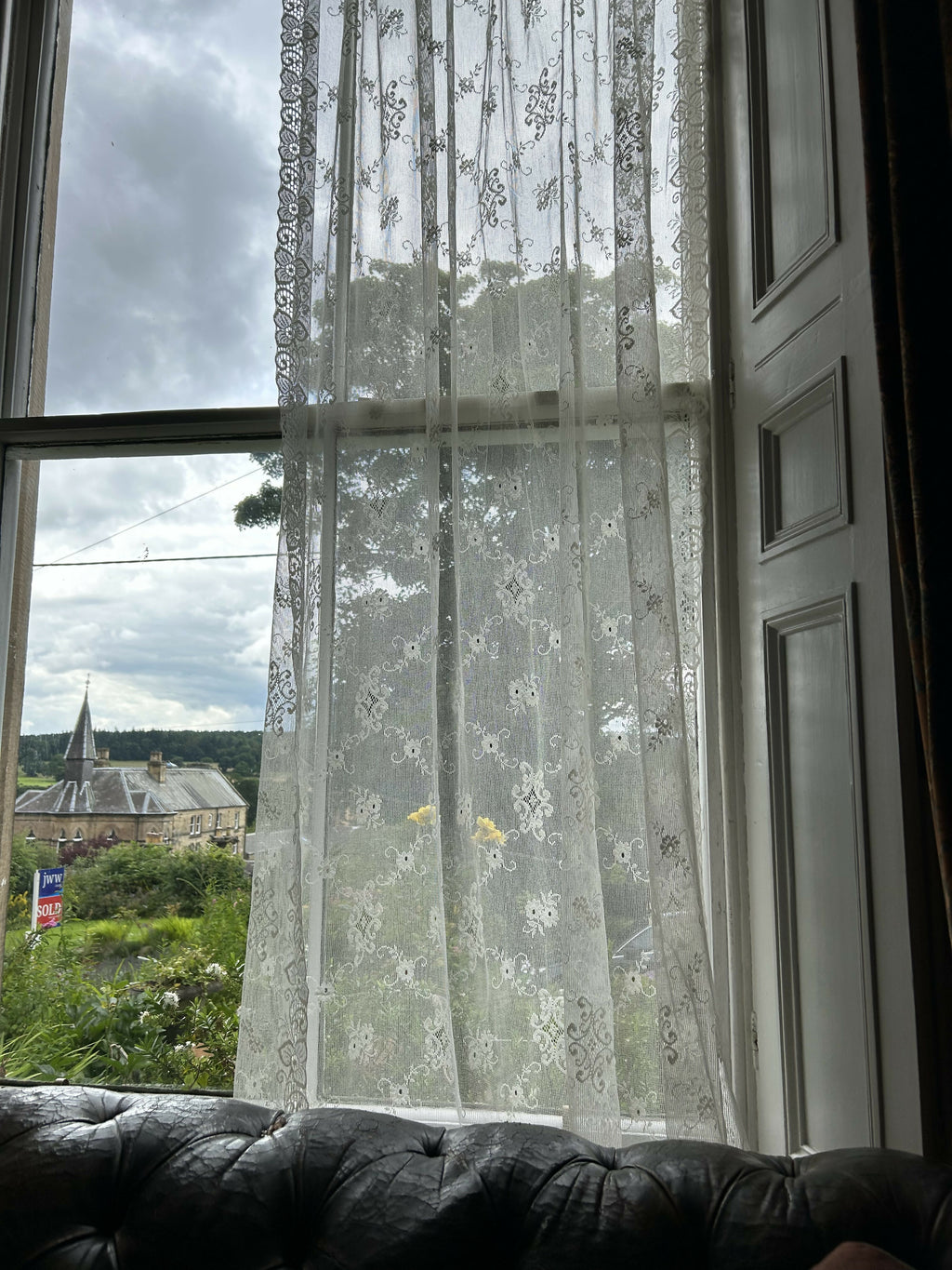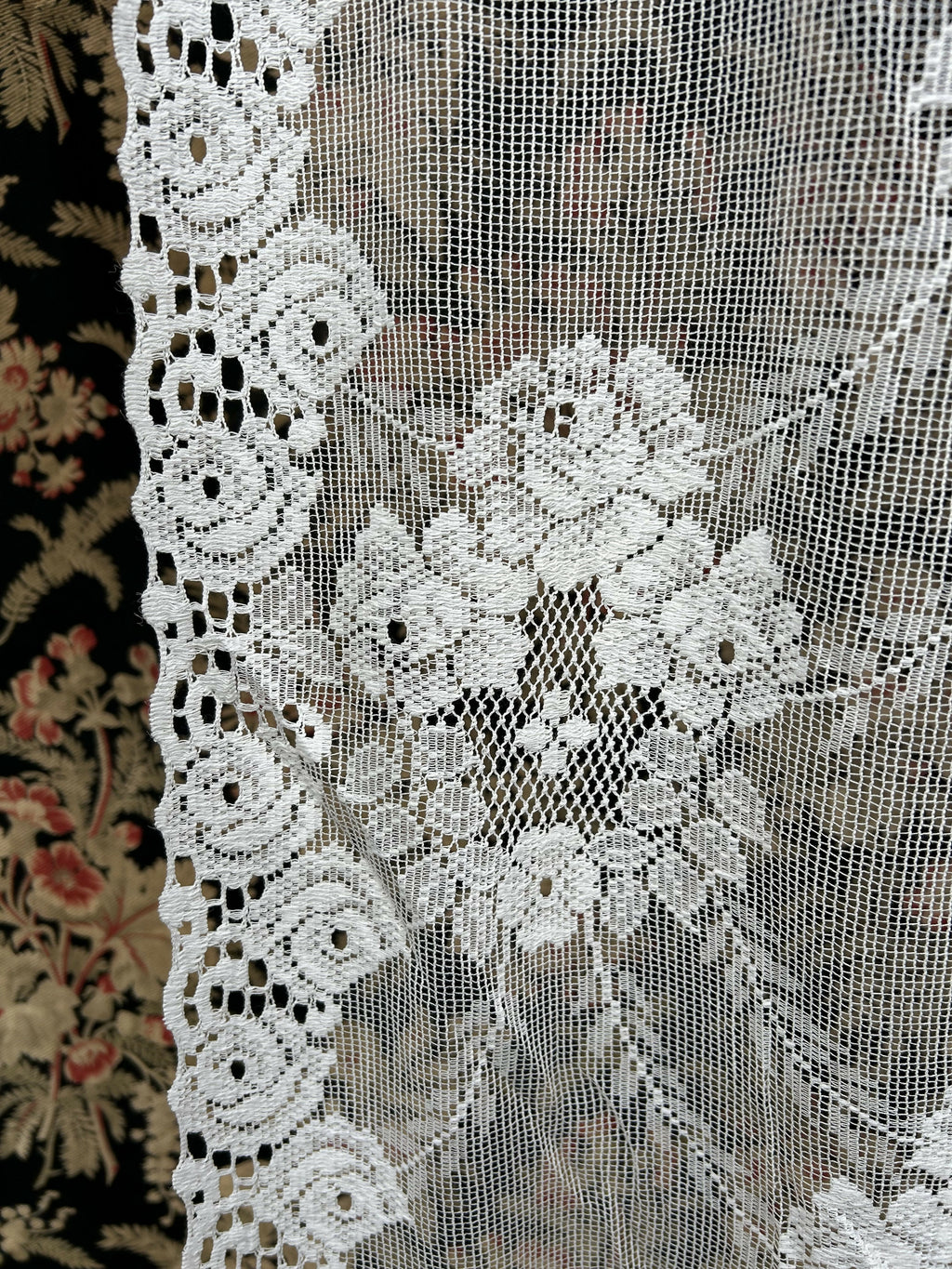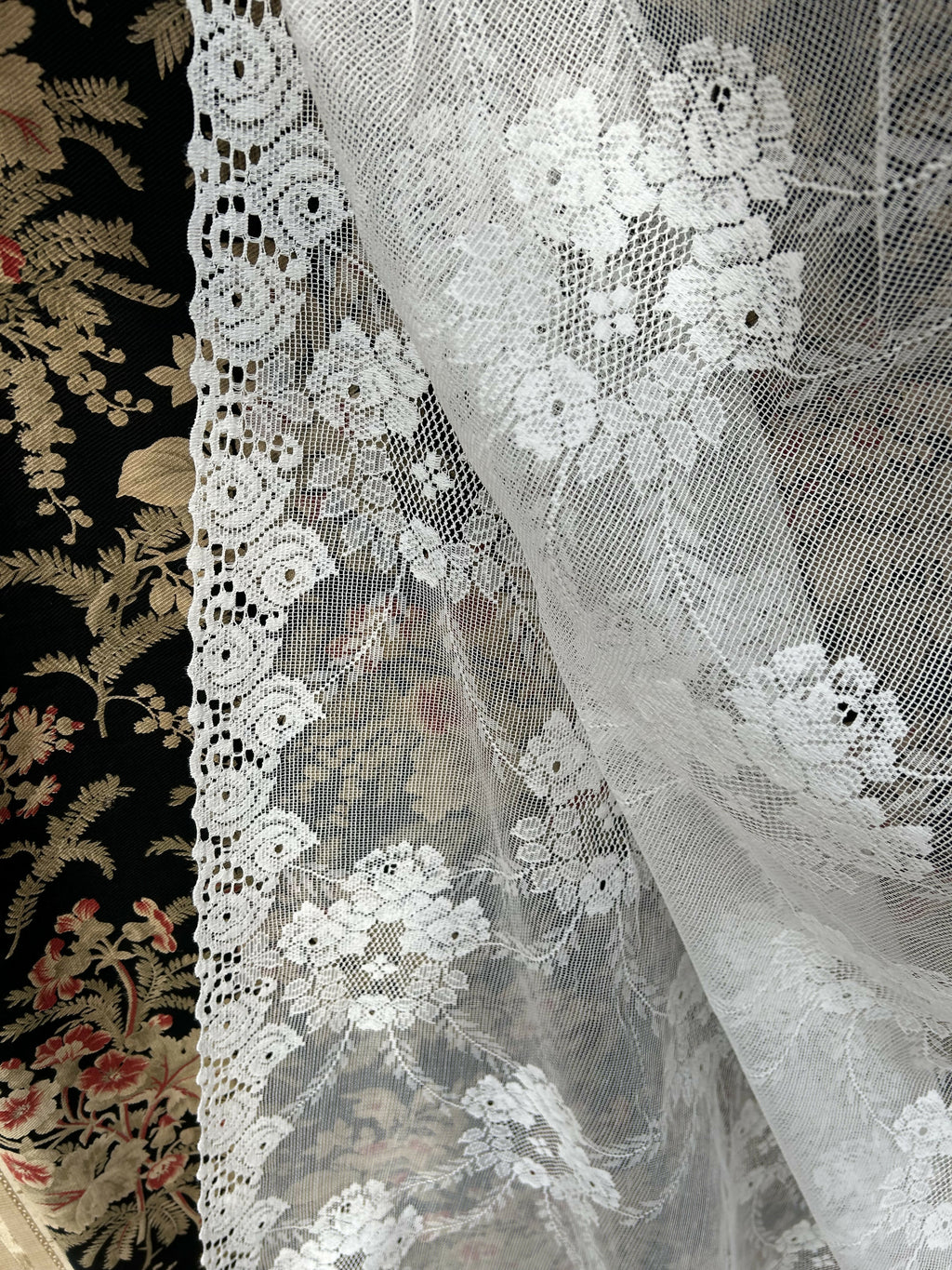 White in colour with original period styling decorating this lace curtaining.