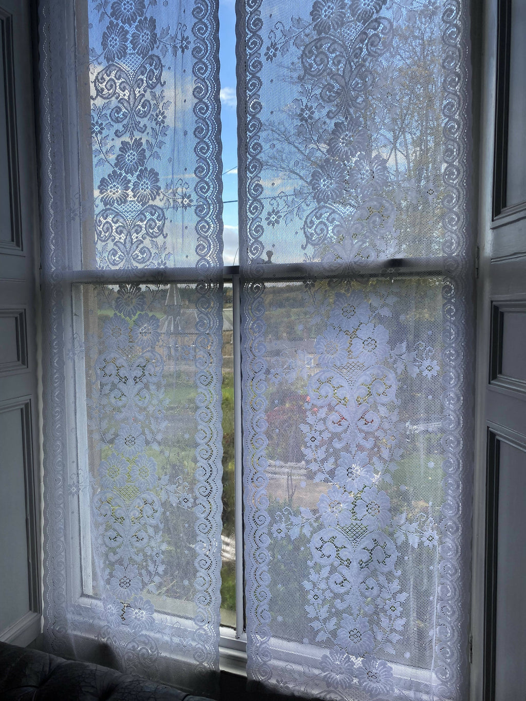 It has a fine cotton weave with delicate scalloped edges to the sides. This is an unfinished panel length, so it will need hemming at the top and bottom.