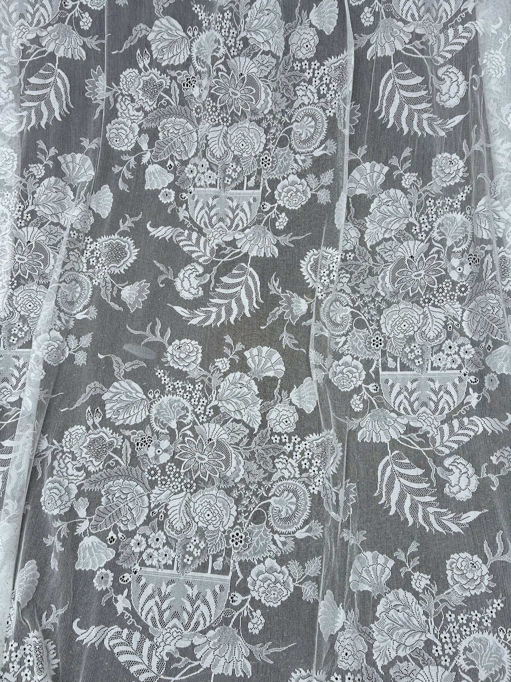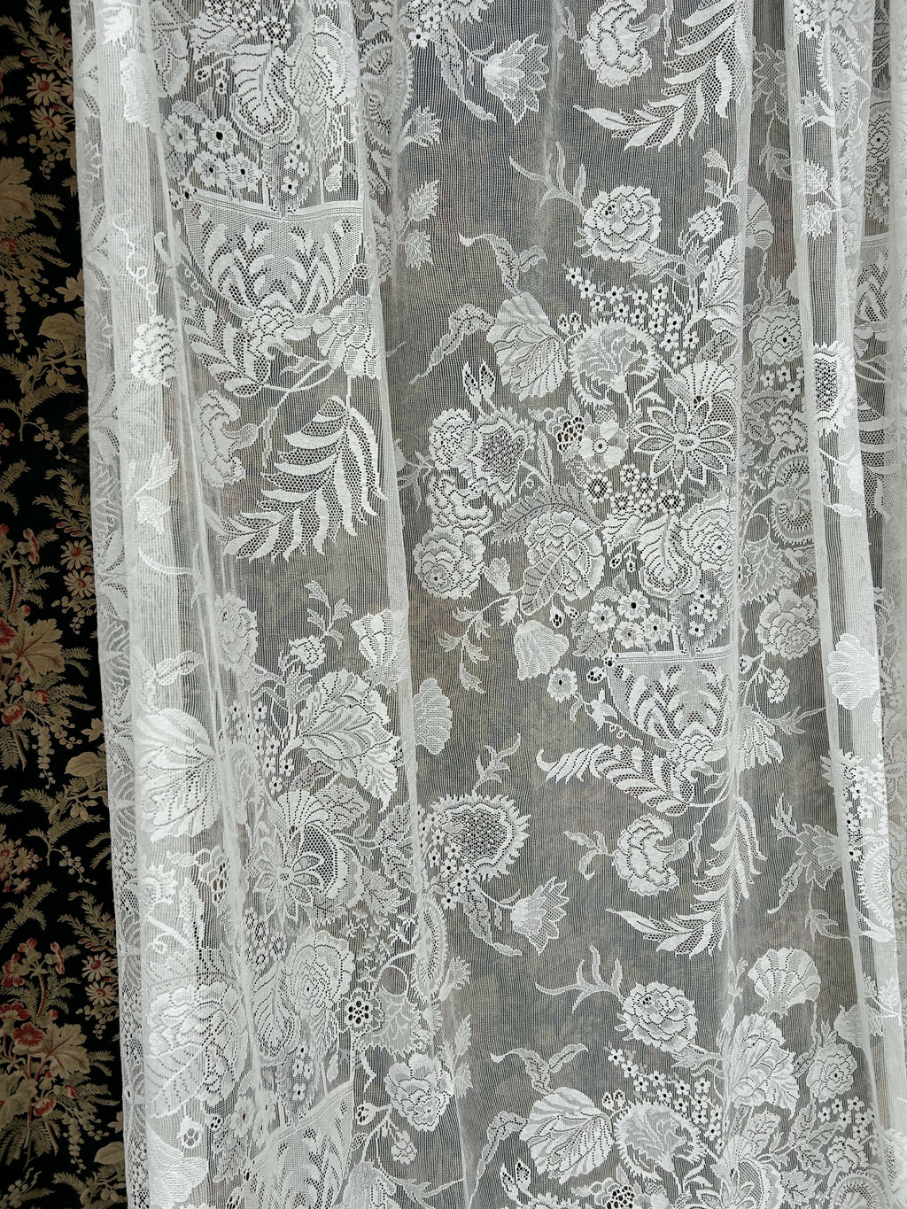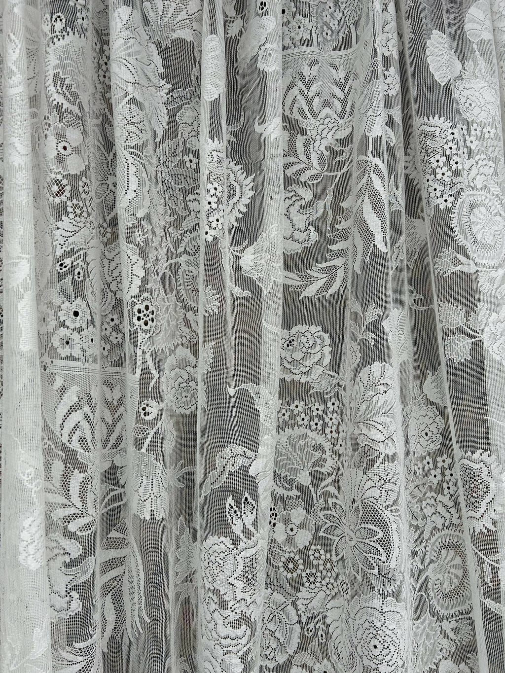 Anna french victorianna style high quality design cotton lace curtaining panel. A traditional cotton lace curtain panel featuring original allover period garlands classical point d'espirit decoration. A sheer, highly detailed,
