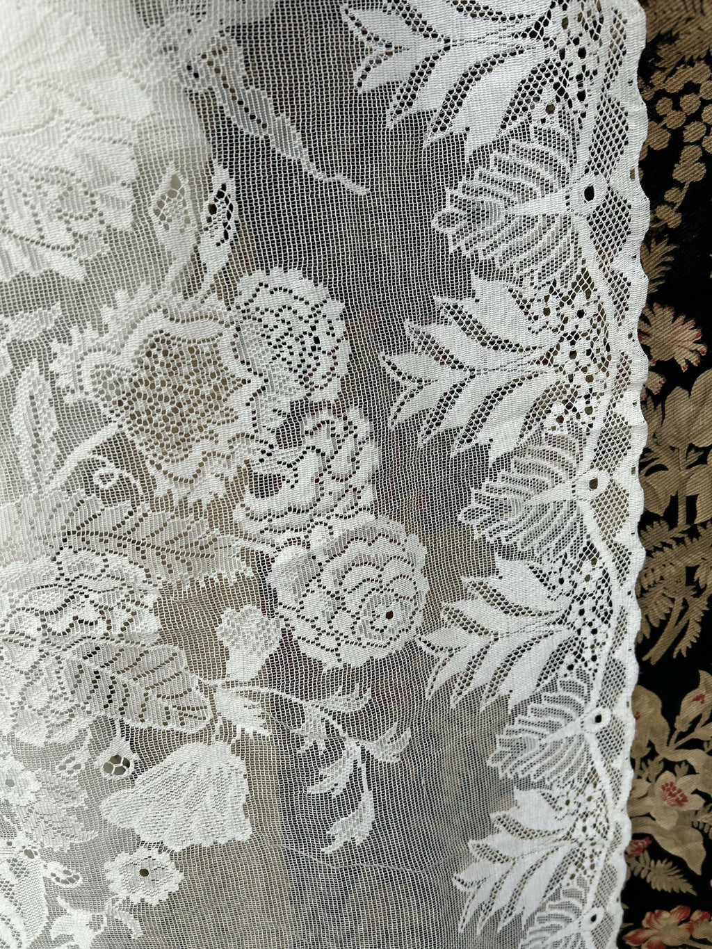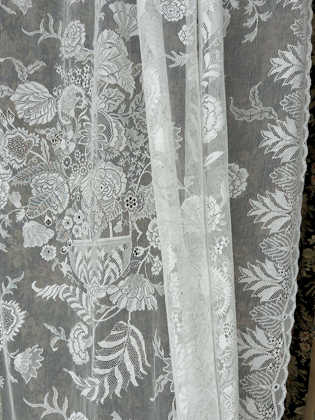 This period design C1900 lace curtain has finished sides. Very easy to use and very decorative. This period lace curtaining has decorative finished sides. This is an unfinished panel length, so it will need hemming at the top and bottom.