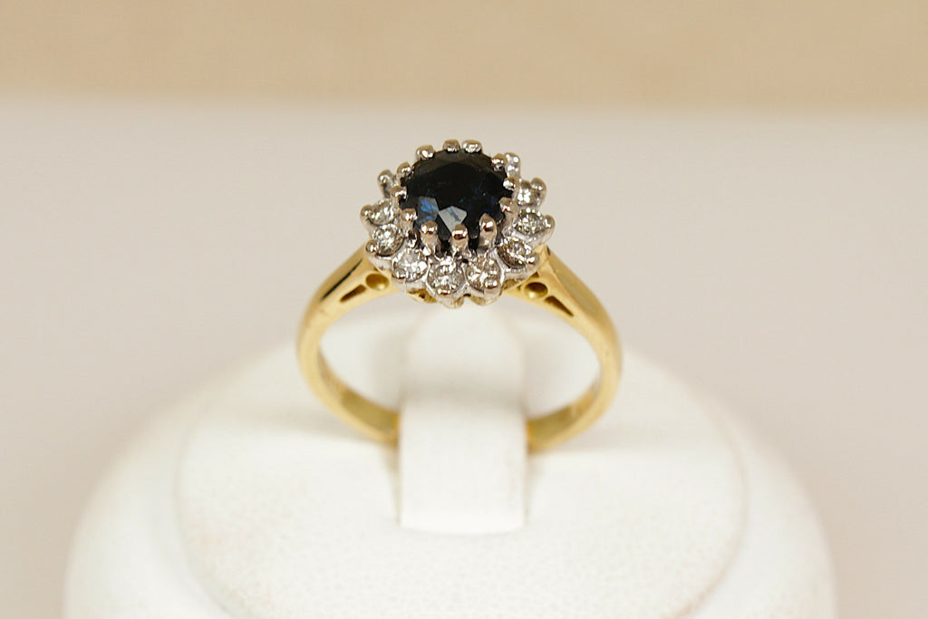 This exquisite 18ct Gold cluster ring features a beautiful round midnight-blue Sapphire, securely claw-set in an elegant crown and basket mount. Surrounding the sapphire are 12 sparkling diamonds, each approximately 0.02ct, all claw-set to create a radiant floral-style cluster that catches the light beautifully.