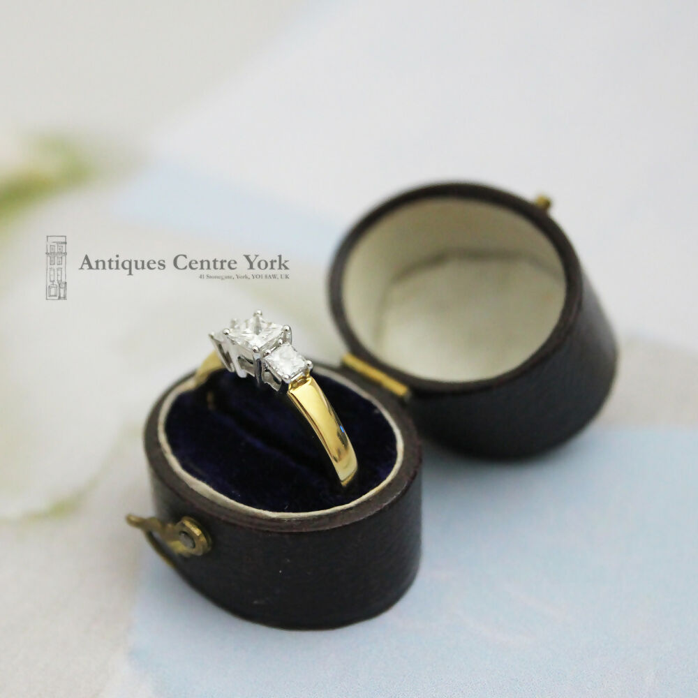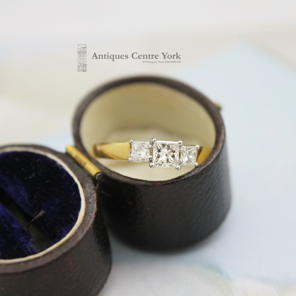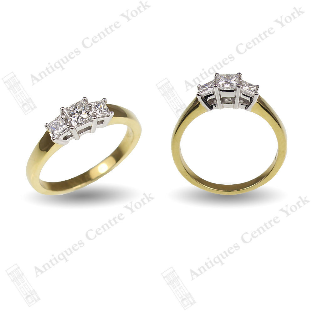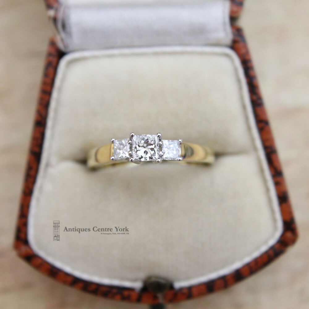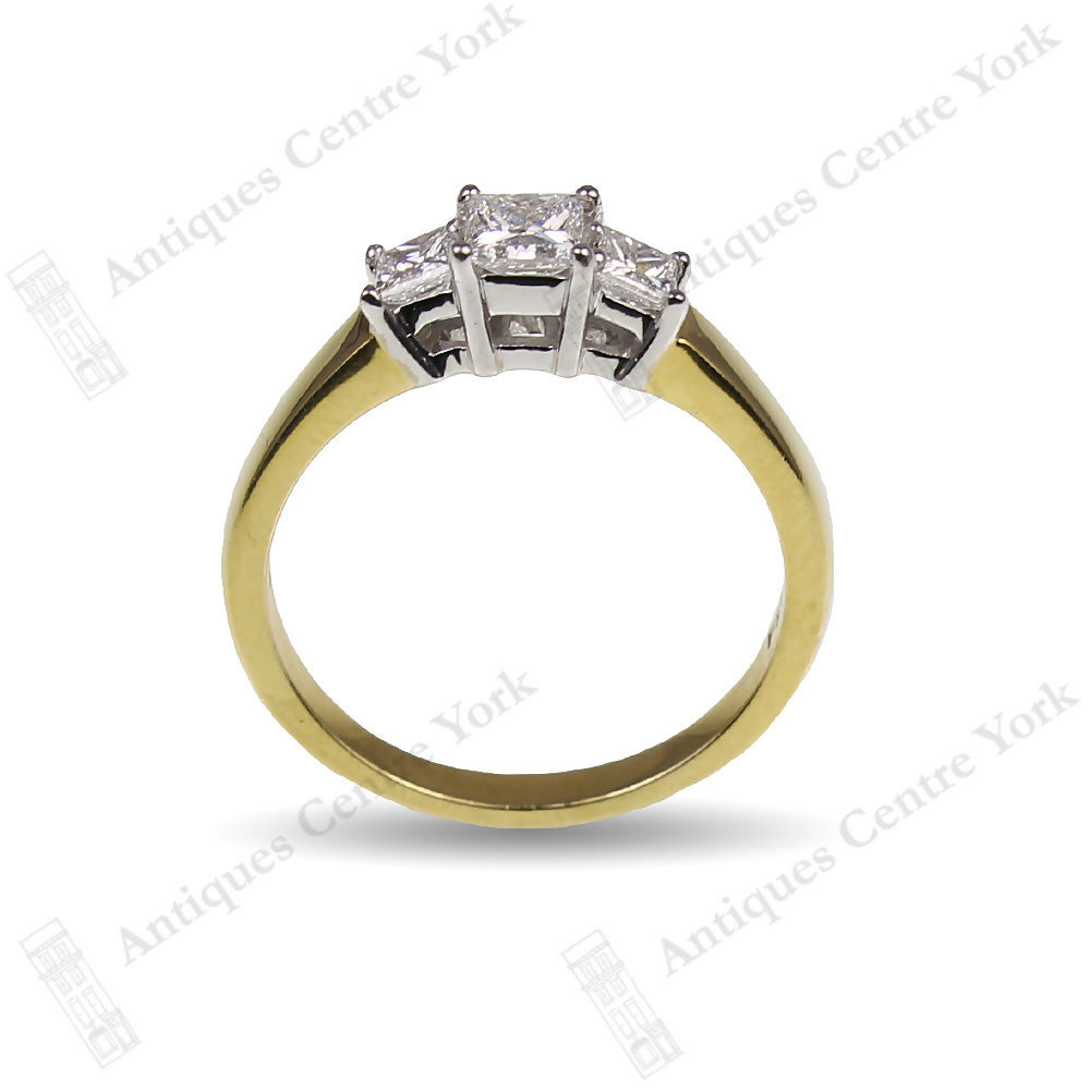 18ct diamond 3 stone ring set with a raised central princess cut diamond with a slightly smaller princess cut diamond set lower either side. Total diamond content 0.54ct. Colour estimated as F/G. Clarity estimated as VS. Mounted in yellow gold with white gold claw settings. Finger size L. Weight 3.5g. Fully hallmarked London 2008.