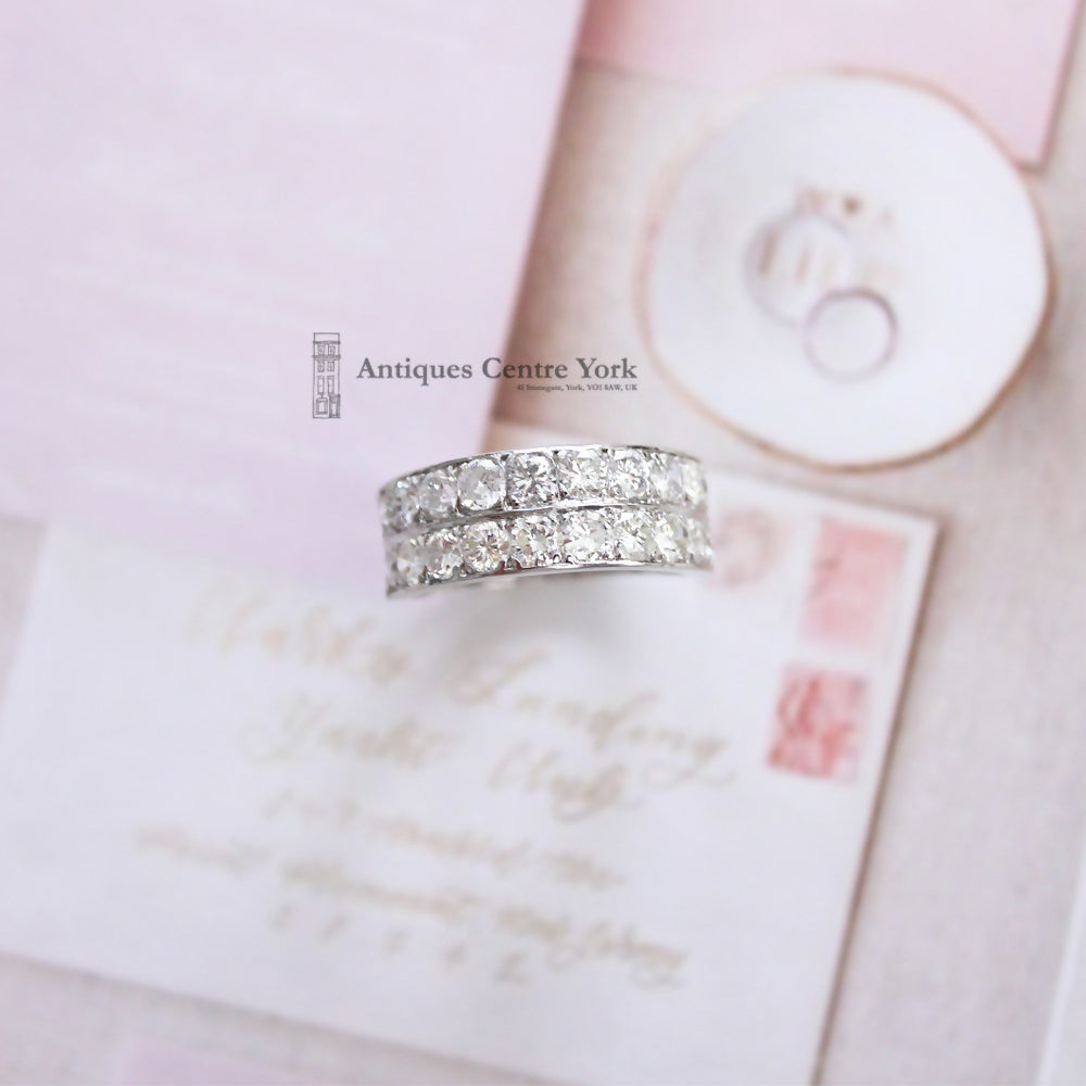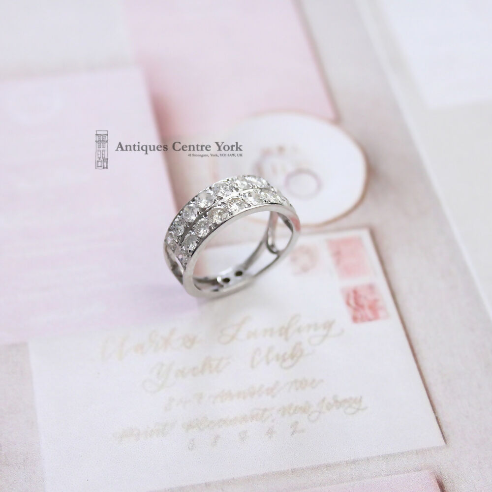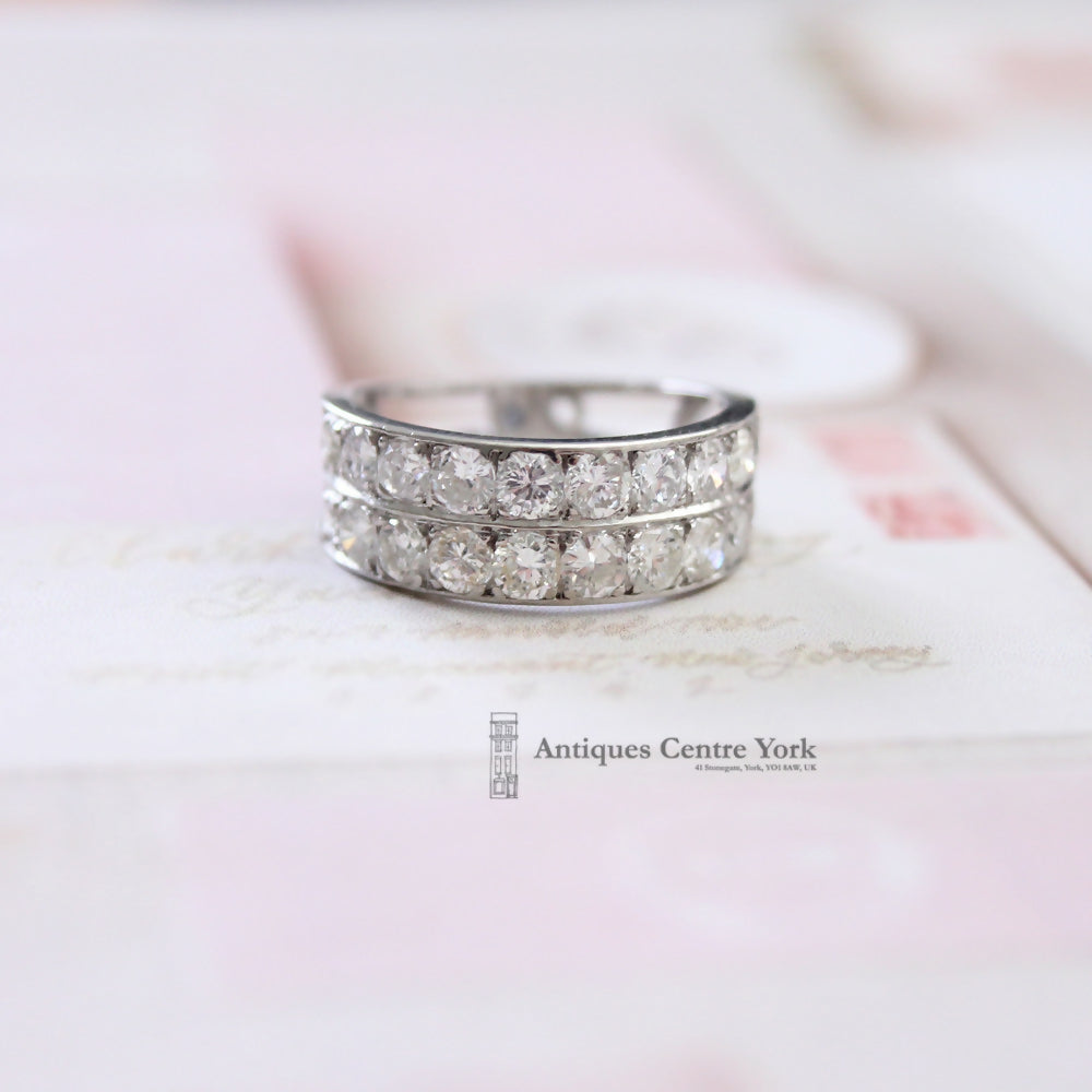 An unusual 2 row diamond ring each row being set with 10 brilliant cut diamonds, slightly graduated from 0.08ct to 0.015ct. The total diamond weight has been estimated as 2.00cts+. Colour ranging from I-K, clarity from SI1-I2. Mounted in all 18ct white gold with individual box settings. Overall the ring sits 8mm deep on the finger, 50% around. Unusual open shank finger size Q (but due to the depth it feels tighter). No hallmarks as believed to be handmade but testing as 18ct white gold. Weight 6.56g. PLEASE NOTE: This item is not in the centre.