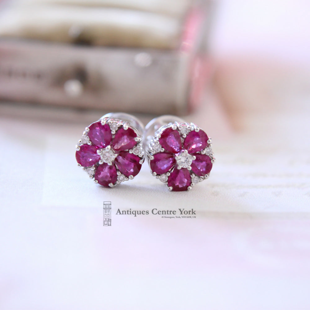 Pretty pair of ruby & diamond cluster earrings. Each set with five pear cut rubies with a single slightly raised diamond to the centre and a single brilliant cut diamond set between each ruby. Overall the clusters measure 8.85mm. All 18ct white gold with claw settings and post and butterfly fittings. Fully hallmarked and signed Stockley. Gross weight of pair 3.8g.