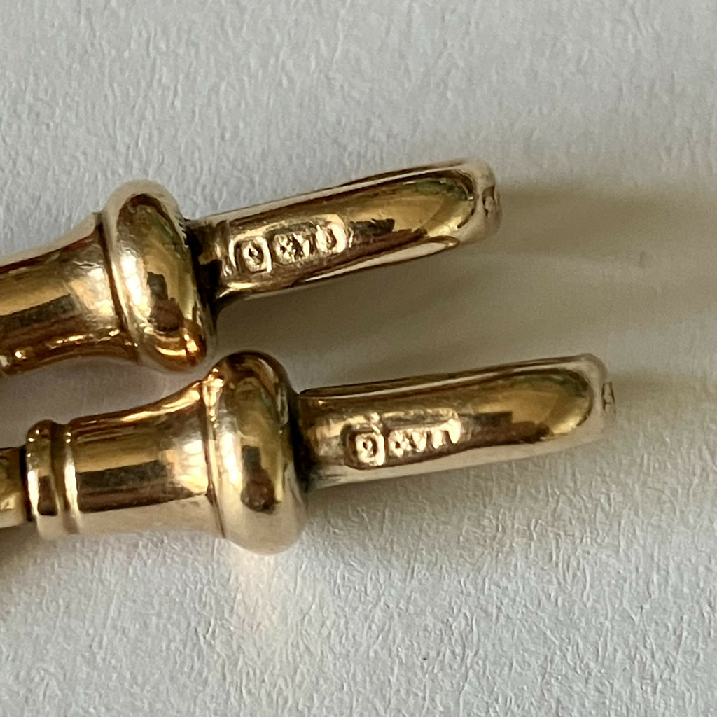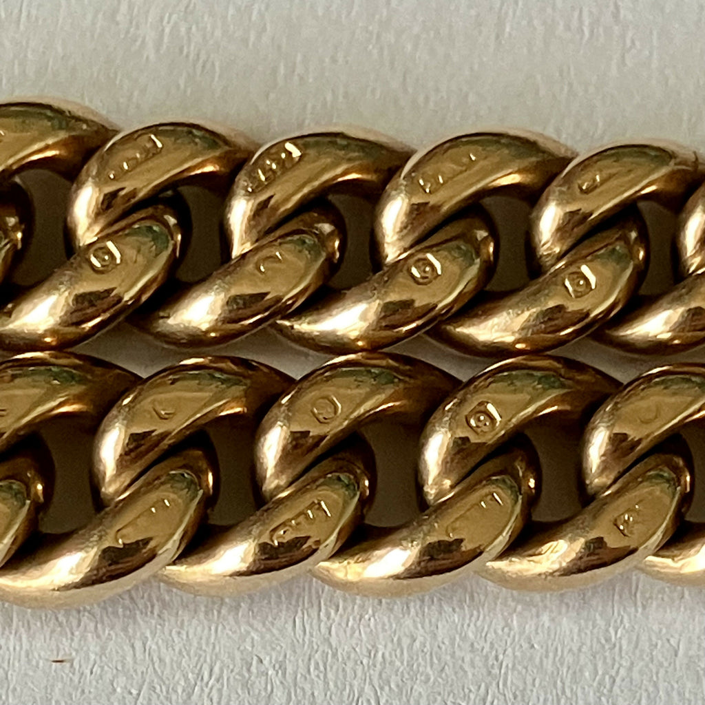 Substantial late Victorian / early Edwardian graduated 9ct gold Albert chain, English manufacture, weighing 56 grams, with full hallmarks throughout and maker’s mark “S Bros”, circa 1895–1908.