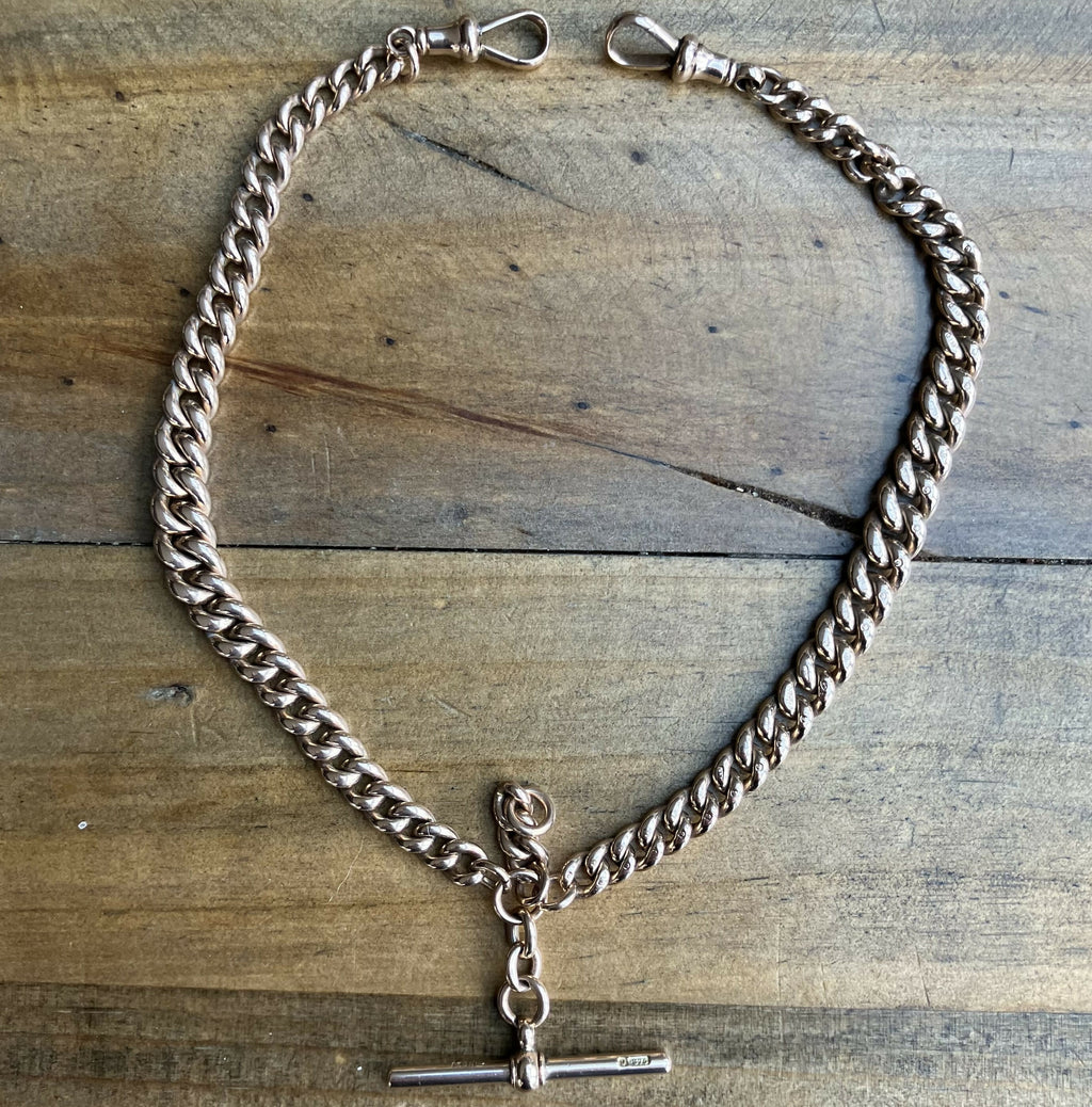 A chunky double Albert chain necklace, beautifully crafted in 9ct gold. The chain graduates in thickness, the widest point being approximately 8.3 mm and tapering to 5.7 mm. Each link is clearly stamped 9 ct 375 and the piece features classic dog‑clip clasps and a T‑bar that hangs from the chain.