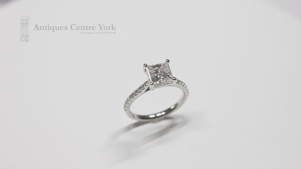 Certified (Anchor) princess cut diamond weighing 1.53cts. Colour G. Clarity VS1. Mounted in all platinum with four claw setting and nine brilliant cut diamonds set into each shoulder. The mount is a "snuggle fit" and most wedding bands and eternity rings will sit snuggly with it. Finger size K. Beautiful and elegant.