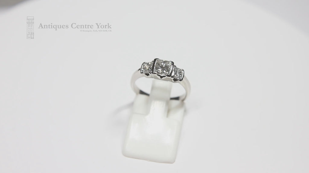 Diamond 3 stone ring set with a raised central princess cut diamond weighing an estimated 0.75ct with a smaller princess cut diamond set slightly lower either side, each weighing an estimated 0.35ct. Total diamond content estimated as 1.45cts. Colour estimated as F/G. Clarity estimated as VS. Mounted in all platinum with semi rub over settings. Finger size L. Weight 5g. Fully hallmarked London 2009.