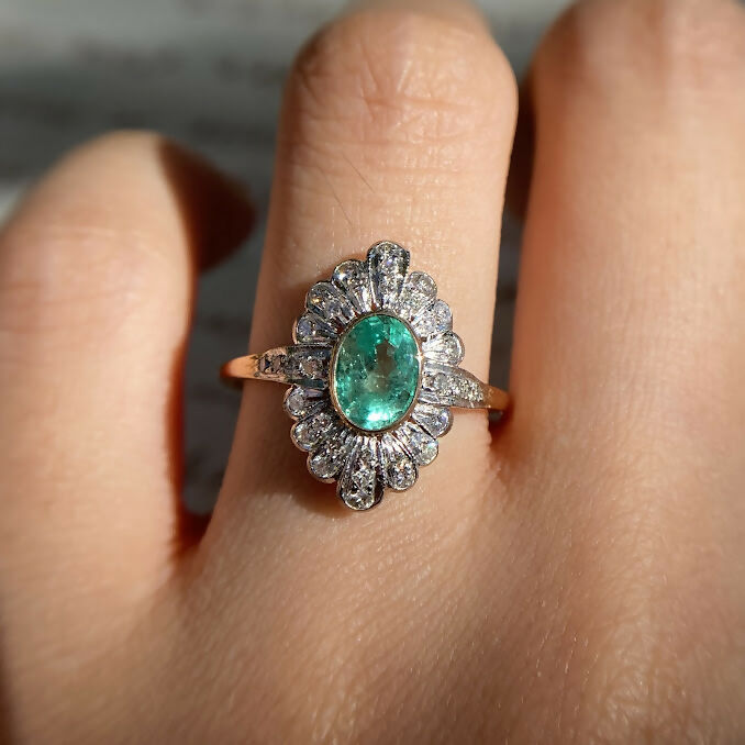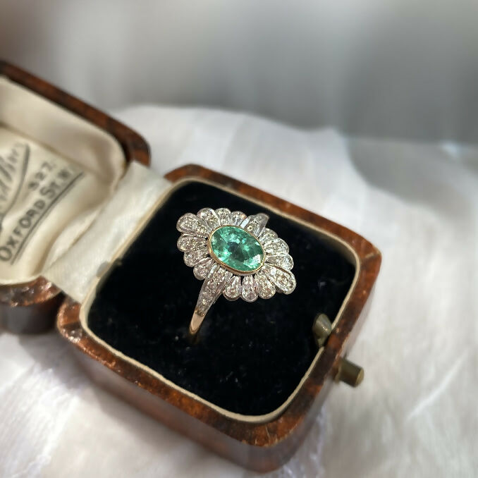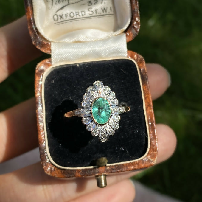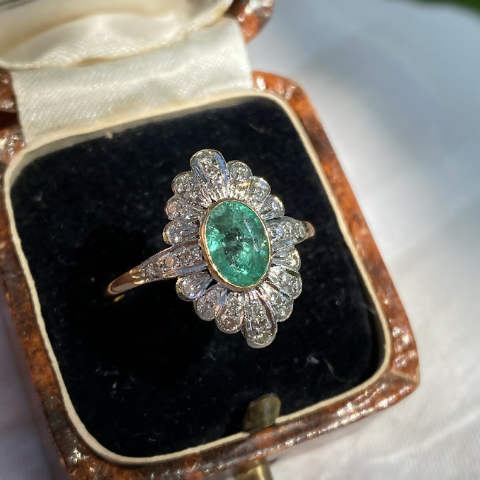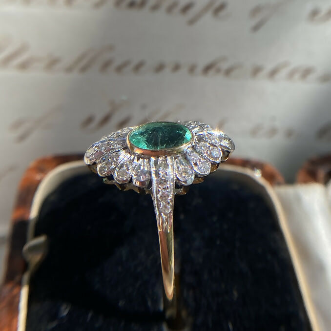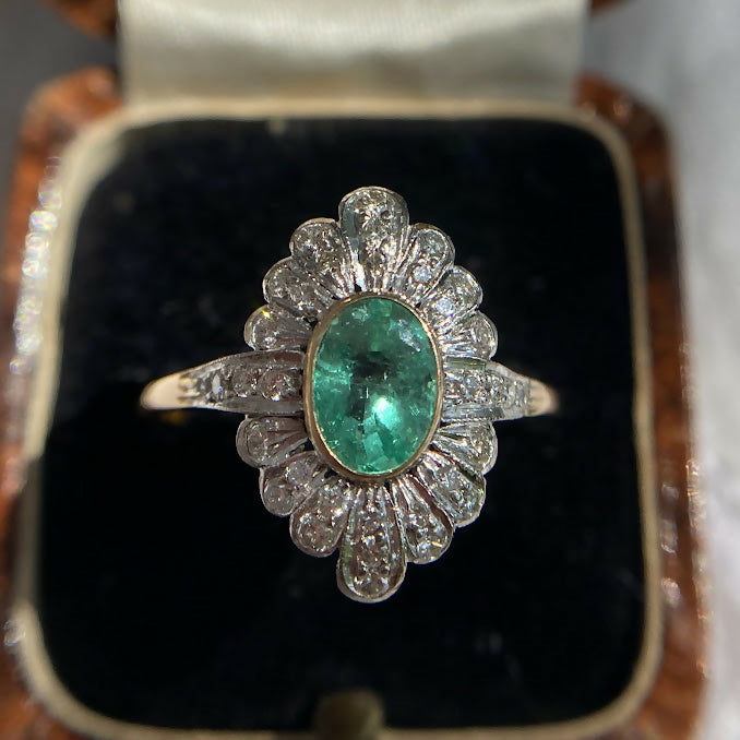 This beautiful emerald diamond navette ring, featuring a 1.6 carat natural Colombian emerald. Set in a classic rub over setting, the emerald is beautifully complemented by a dazzling array of brilliant diamonds.