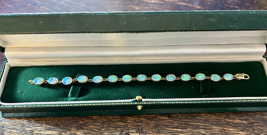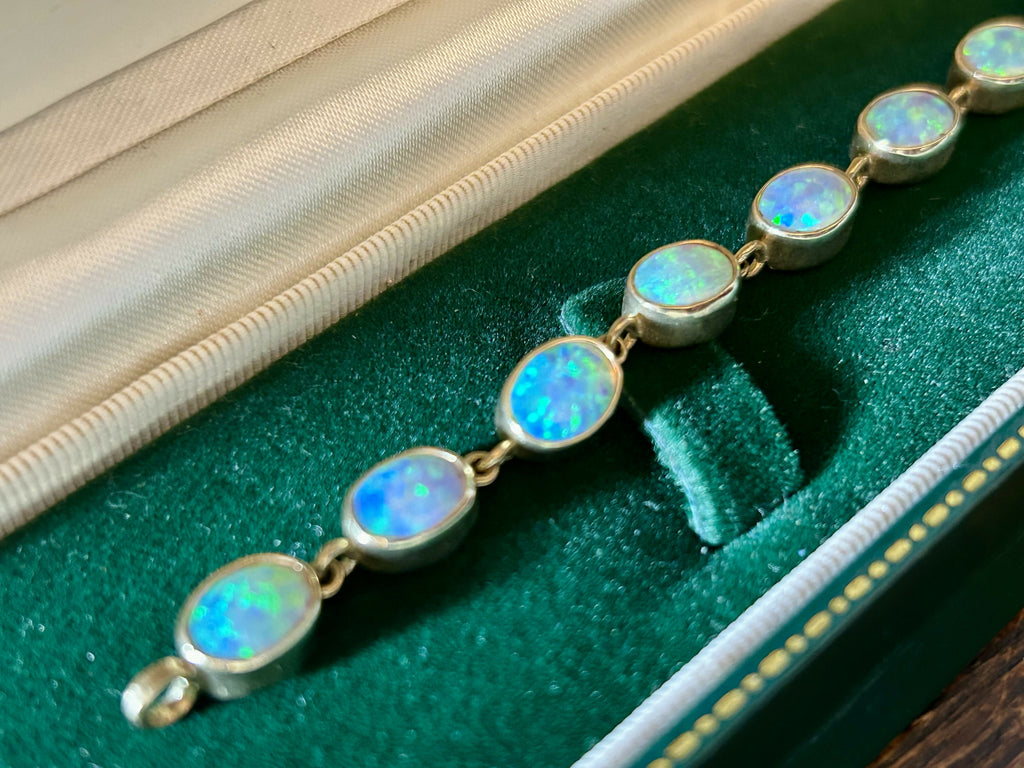 Presented in excellent condition, the bracelet has been carefully maintained, with all opals intact and showing exceptional colour and clarity. The secure clasp ensures confidence and ease of wear, making it suitable for both everyday elegance and special occasions.