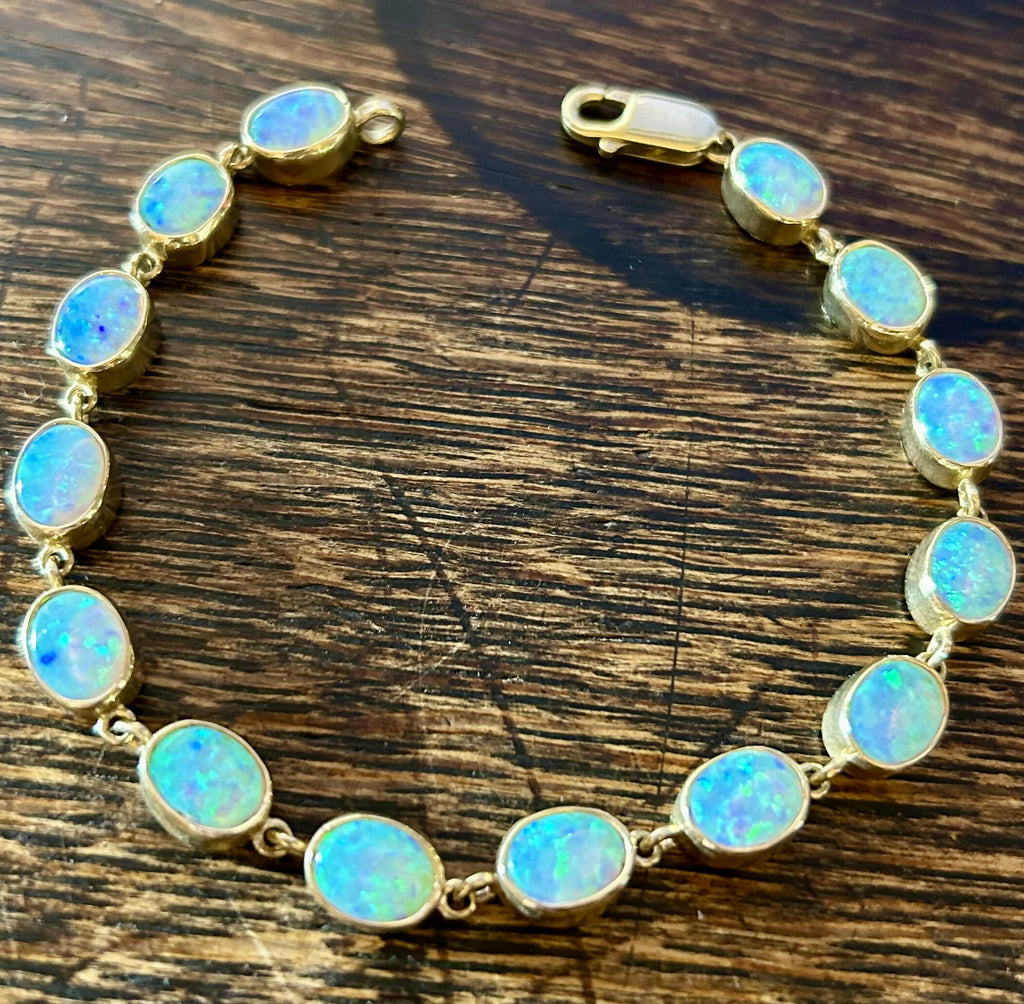 Elegantly designed to sit comfortably on the wrist, this bracelet offers both refinement and wearability. The warm gold setting perfectly complements the opals’ natural brilliance, enhancing their depth and luminosity while allowing each stone to take centre stage.