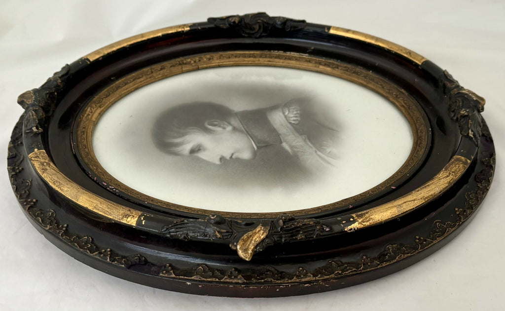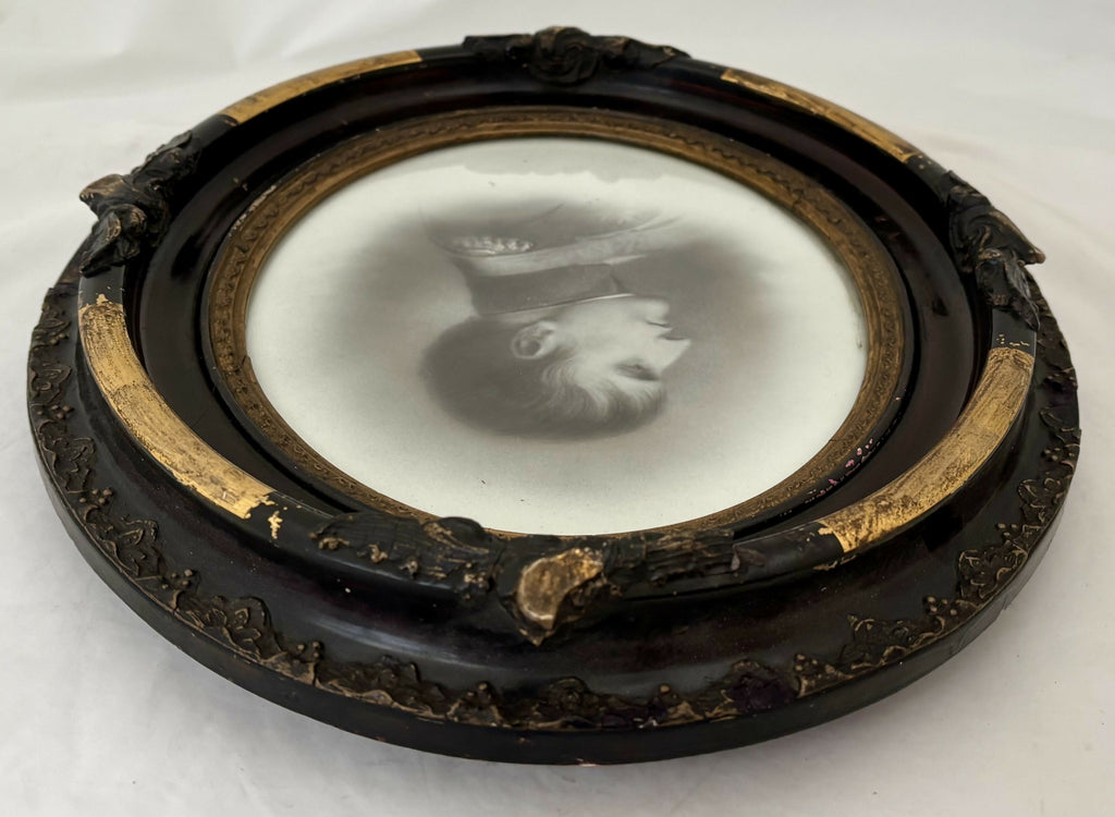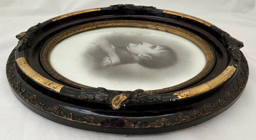 In good condition with frame wear. No ceramic portrait damage. I have not removed the portrait from the frame.