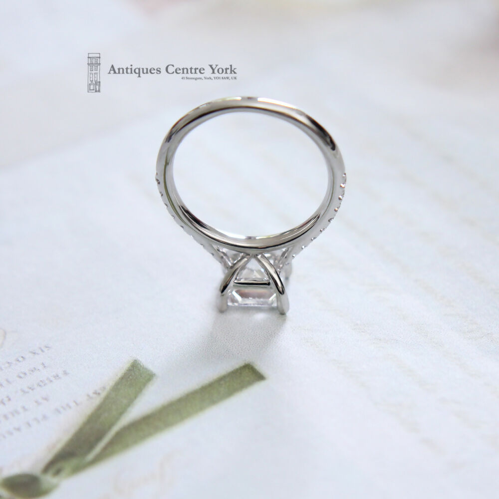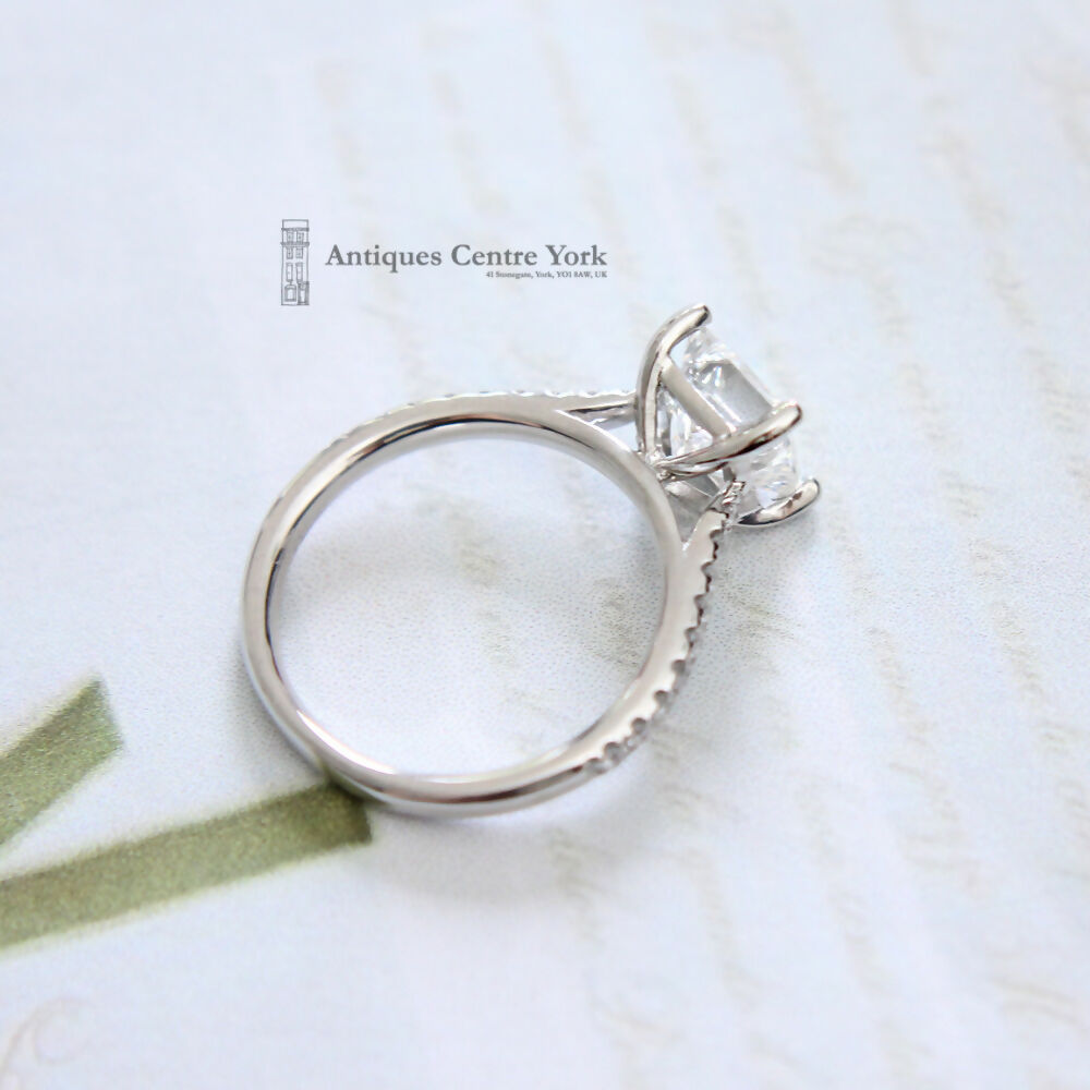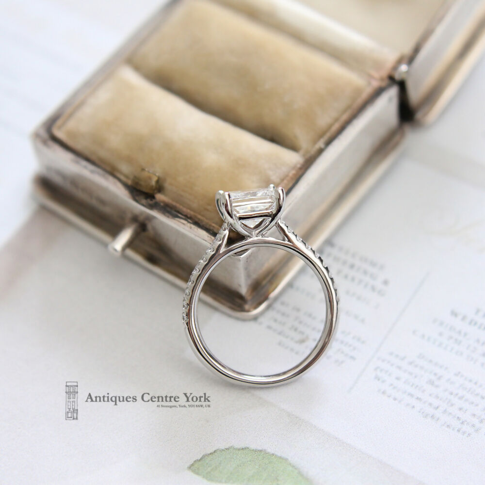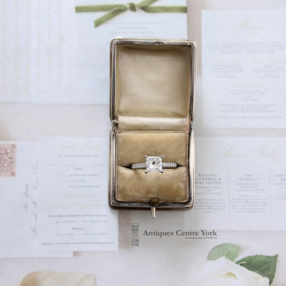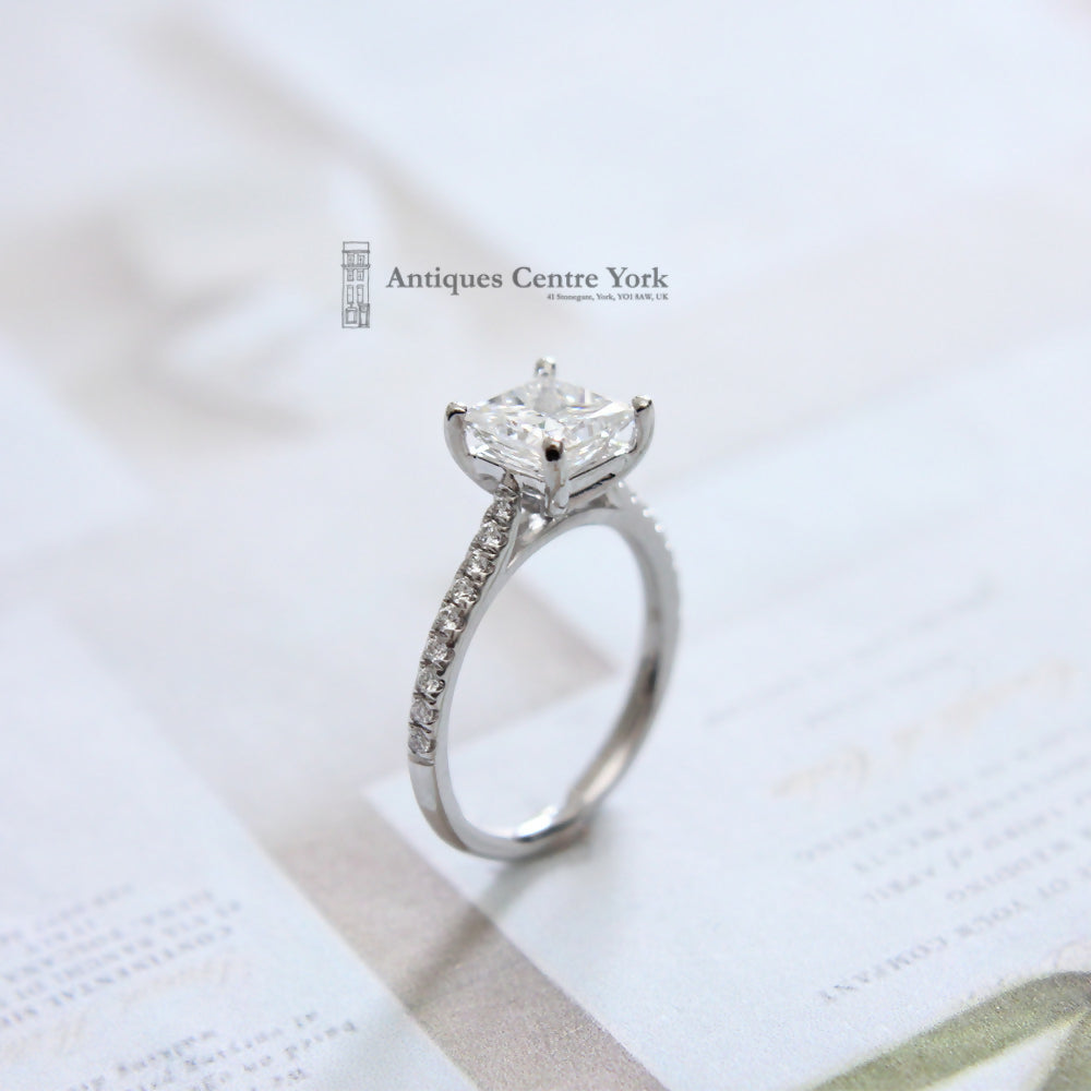 Certified (Anchor) princess cut diamond weighing 1.53cts. Colour G. Clarity VS1. Mounted in all platinum with four claw setting and nine brilliant cut diamonds set into each shoulder. The mount is a "snuggle fit" and most wedding bands and eternity rings will sit snuggly with it. Finger size K. Beautiful and elegant.