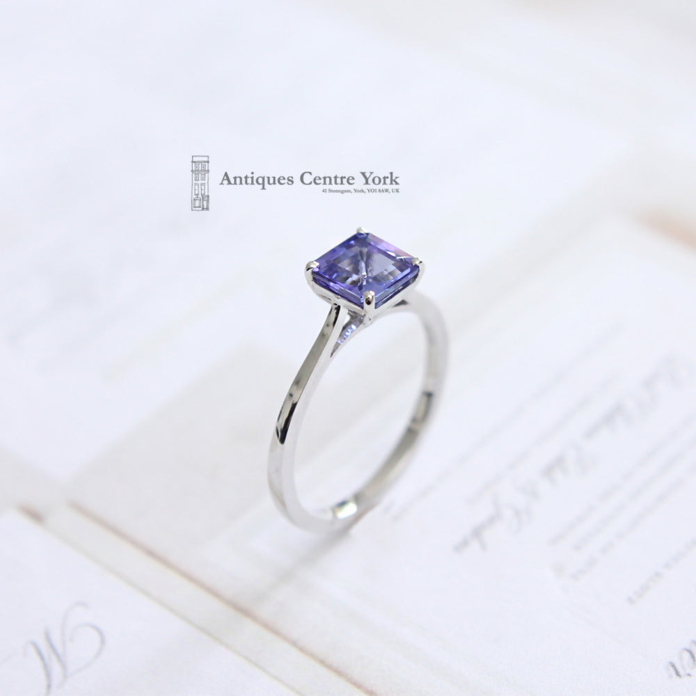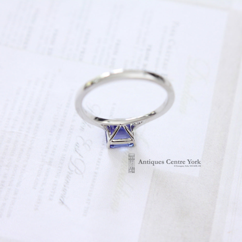 An engagement ring with a twist. A stunning AAA quality Asscher cut tanzanite weighing 2.00cts mounted in a simple platinum high set 4 claw solitaire ring mount. Finger size S but could easily be sized down. Authenticity certificate from Gemporia, Tomas Rae luxury range. Snuggle fit mount which looks beautiful next to a diamond band.