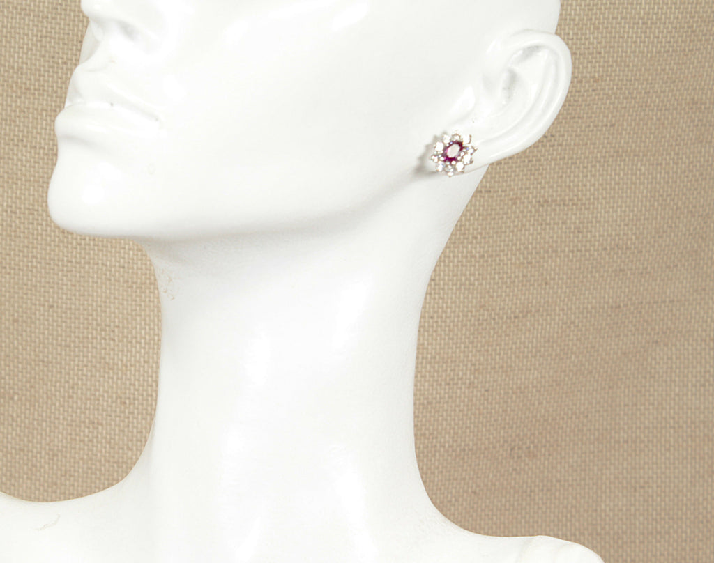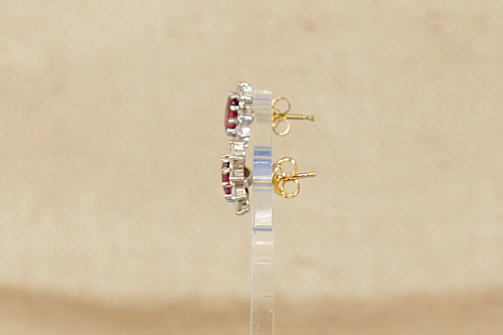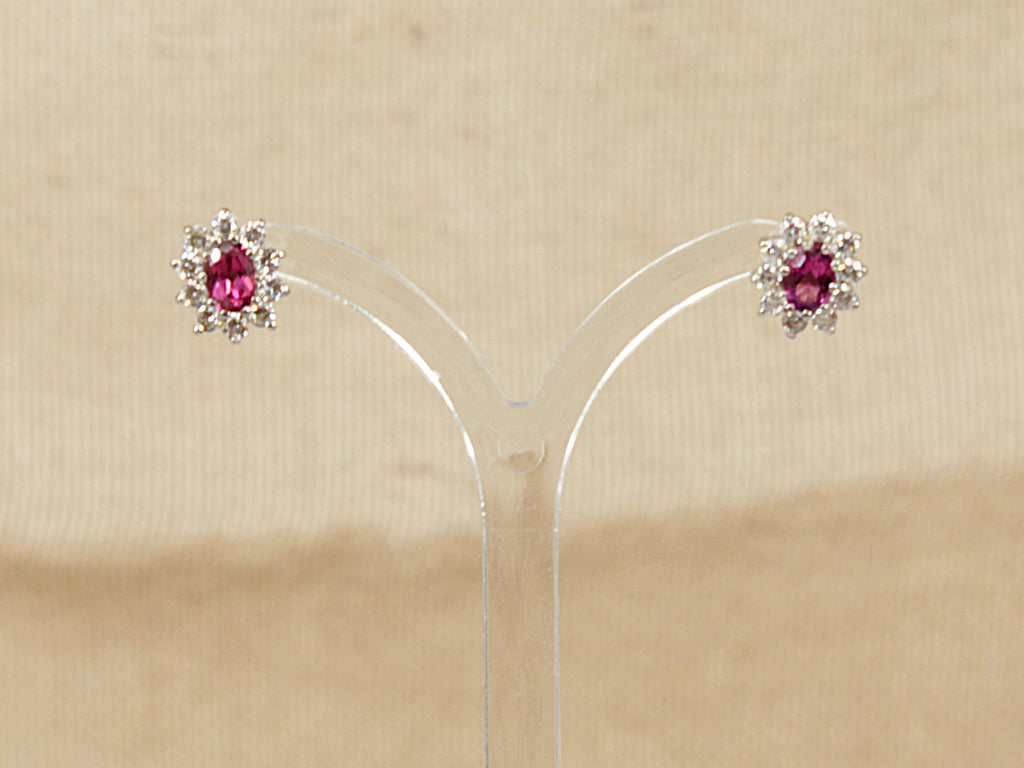 This classic and elegant pair of 9ct Gold stud earrings features an oval, faceted Almandine Garnet, securely claw set at the centre. Surrounding the garnet is a sparkling halo of round cubic zirconia stones, also claw set, adding brilliance and contrast to the rich red tones of the garnet.