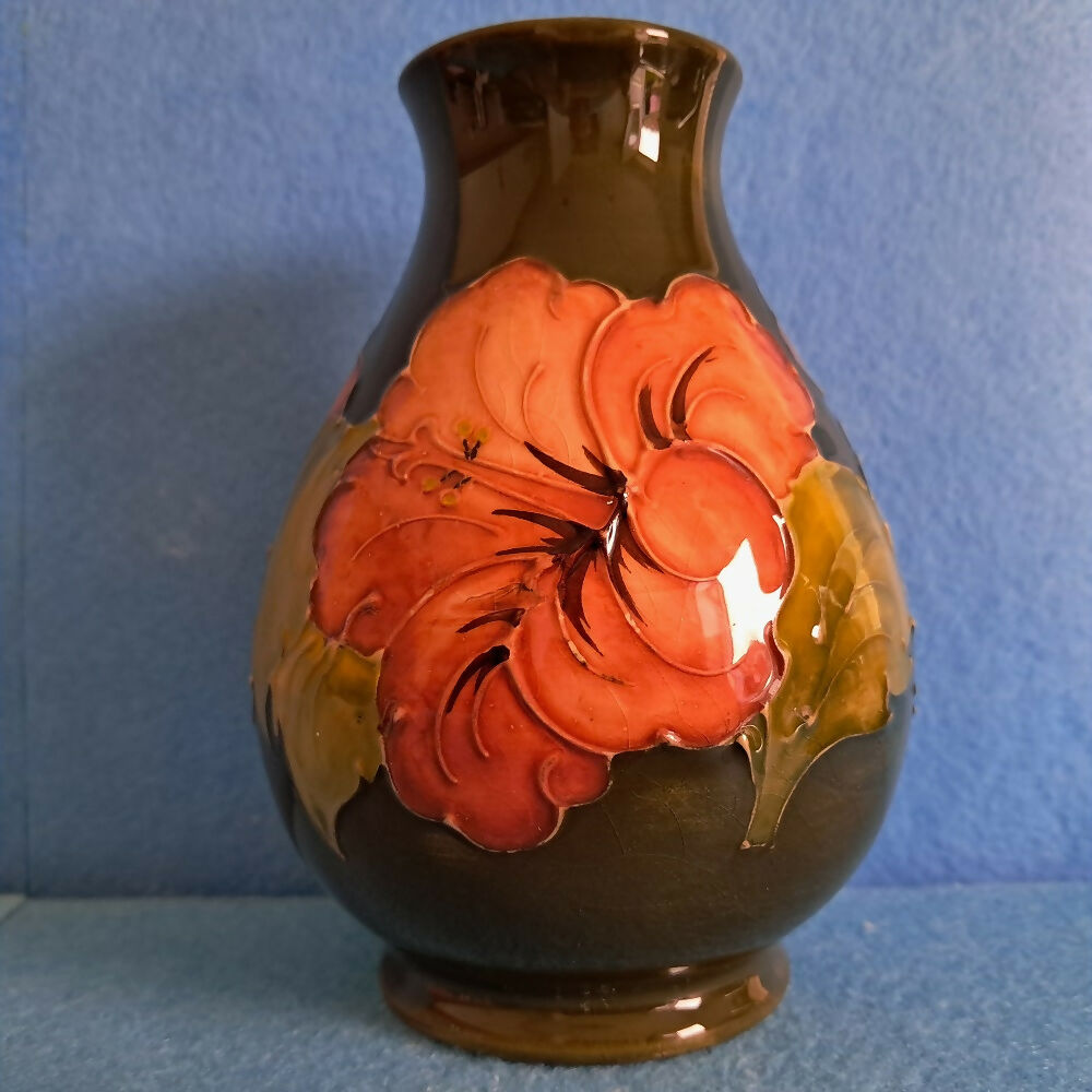 A vintage Moorcroft vase in the Hibiscus pattern by Walter Moorcroft.