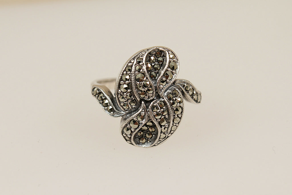 This bold and substantial Silver Art Deco ring features a striking swirling figure-of-eight design, richly encrusted with sparkling Marcasite. The shoulders are enhanced with a decorative twist motif, adding depth and movement to the overall design. Heavy and well made, the ring makes a confident statement on the finger. Inside the band, it is stamped SILVER, confirming its metal content.
