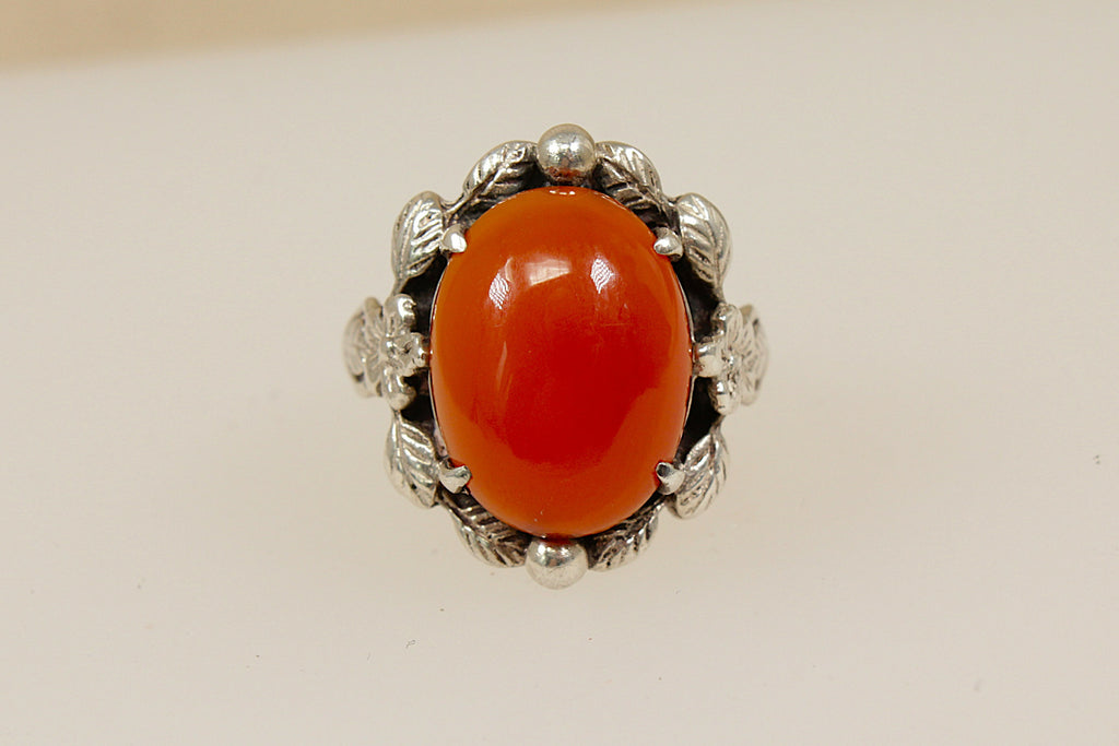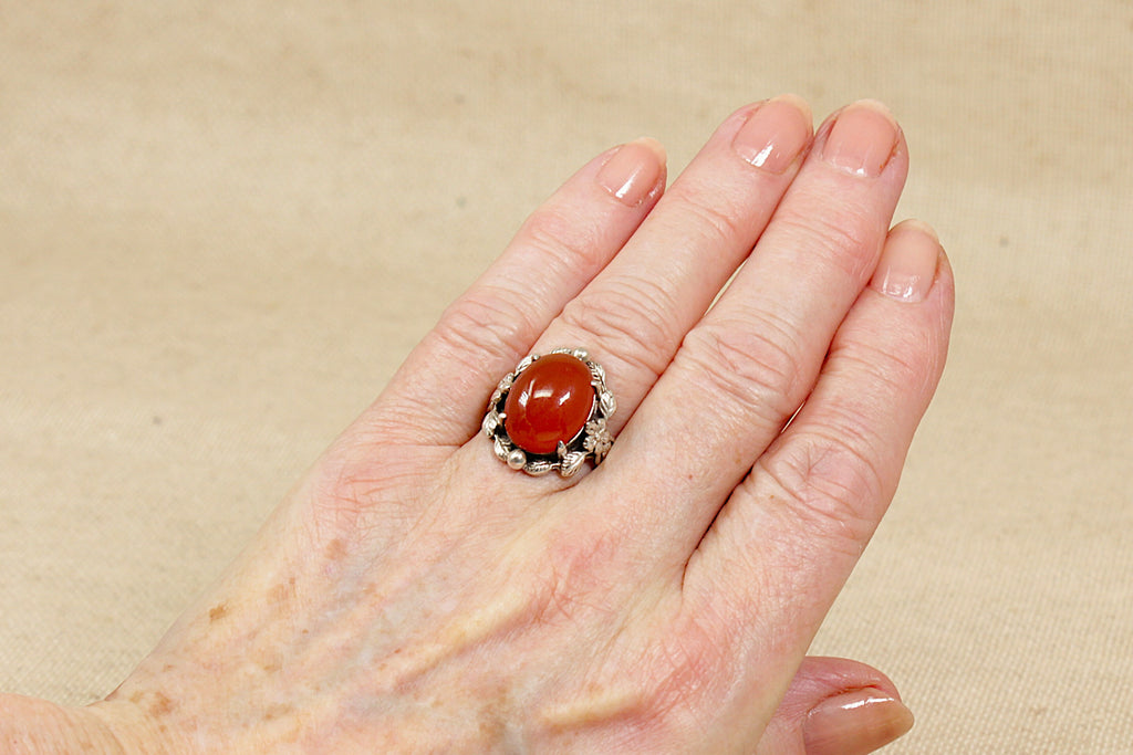 This stunning Arts & Crafts Silver ring is a superb example of early 20th-century handcrafted jewellery. The ring features a large cabochon Carnelian, rich in warm orange-red tones, set in a chunky four-claw setting that gives the piece wonderful presence and strength.