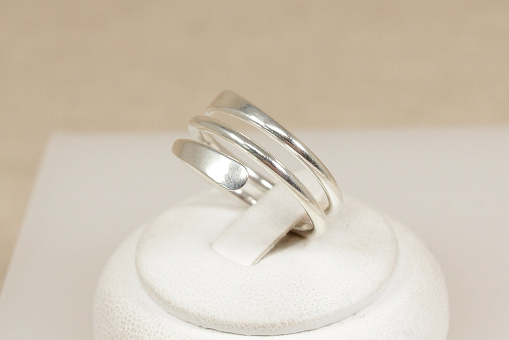 This elegant Silver ring features a graceful twist design that wraps around the finger, ending in three smooth bands at each end of the bands it is slightly flat that gives a modern sculptural look. Expertly crafted with a polished finish, it is stamped 925 inside the band for sterling silver.