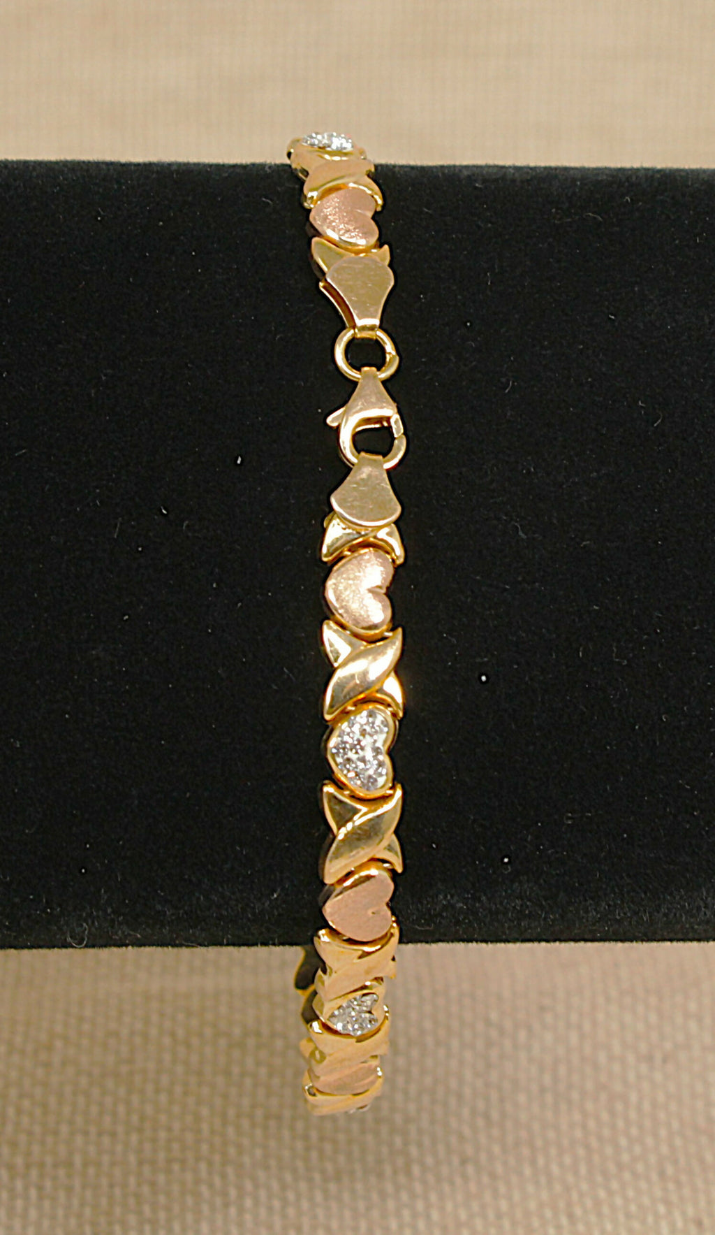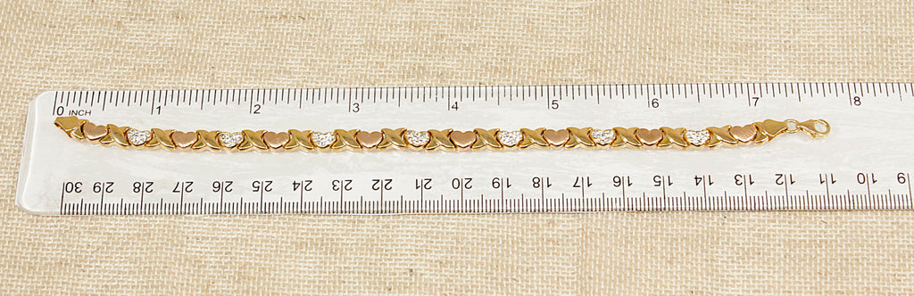 This pretty Silver Gilt heart design bracelet is both elegant and romantic, featuring an alternating pattern of links — a sparkling crystal heart, a smooth polished heart, and an X-shaped connector, all finished in varied tones of gilt coating for a warm, luxurious look.