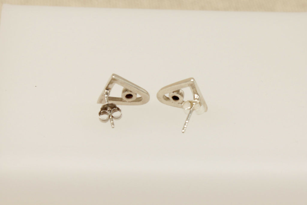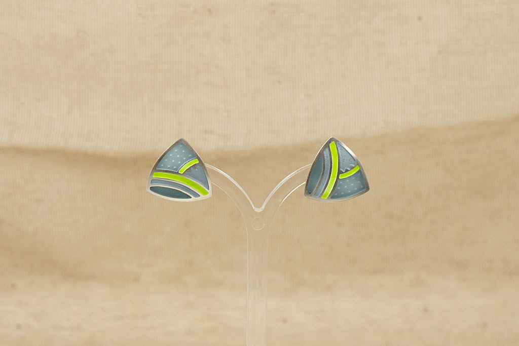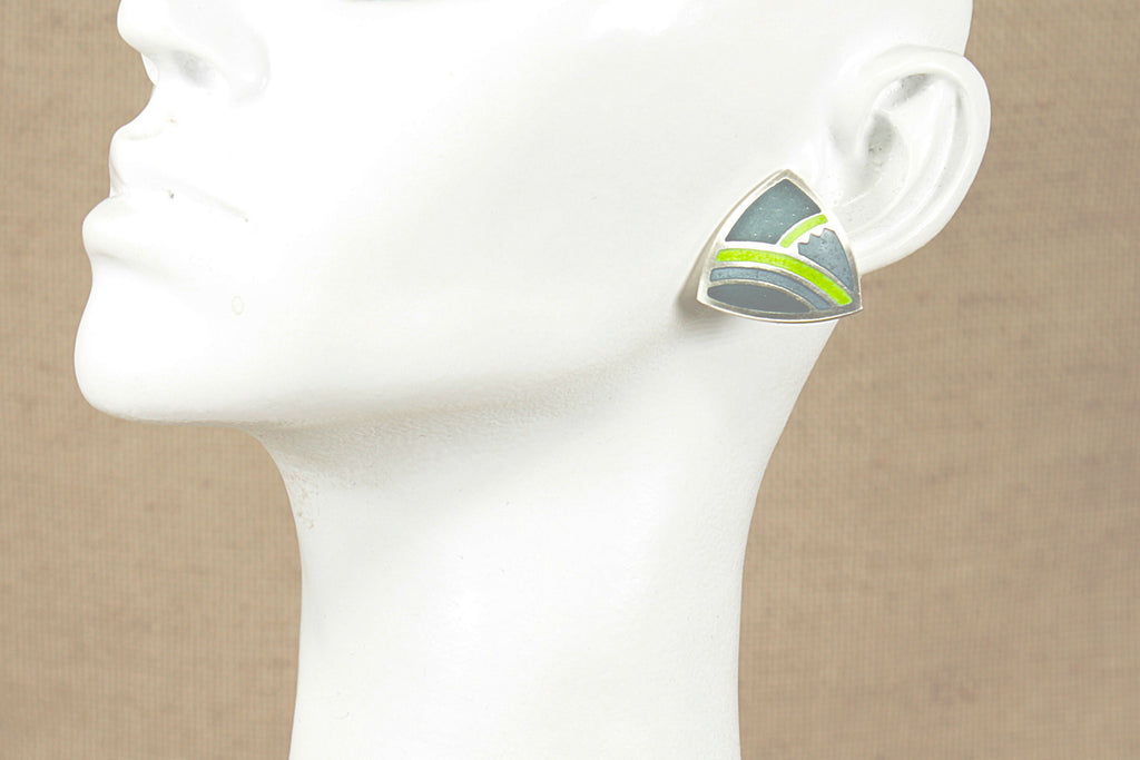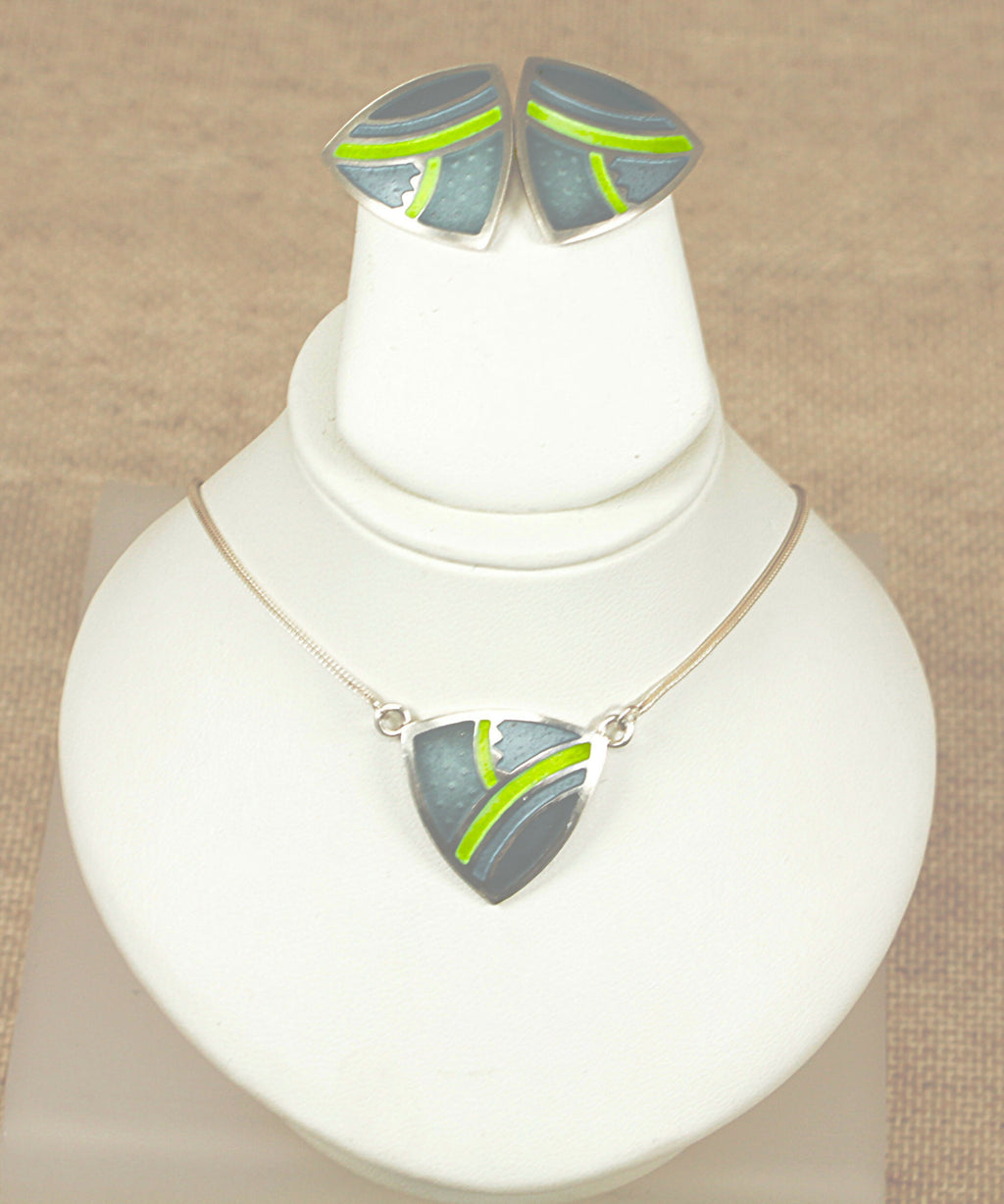 This elegant Silver necklet and earring set features a contemporary curved triangular design with clean geometric lines. The pendant is beautifully decorated with varying shades of green enamel set against a smooth silver finish, creating a striking modern look. The matching triangular silver stud earrings mirror the pendant’s design perfectly for a coordinated set.
