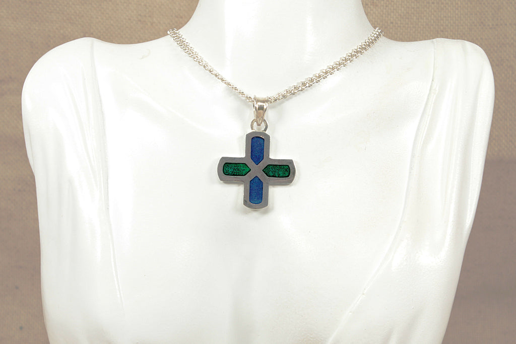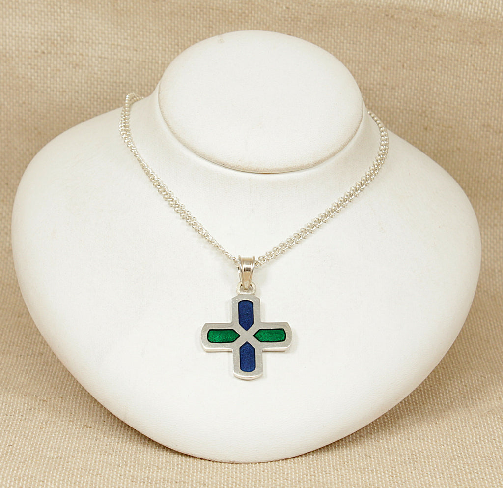 This striking Italian Silver cross pendant features a smooth, polished finish accented with inlaid blue and green enamel, creating a bold and contemporary look. The pendant measures approximately 43mm in length (including the bail) and 30mm across, giving it a substantial presence.