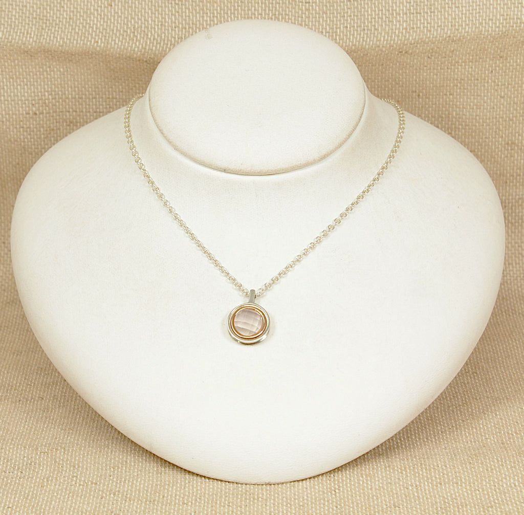 This elegant Silver pendant by renowned Welsh designer Clogau features a beautifully faceted round rose quartz stone, securely bezel-set in warm rose Gold overlay. The round pendant hangs from an 18-inch sterling Silver belcher (rolo) chain, offering a classic and versatile look.