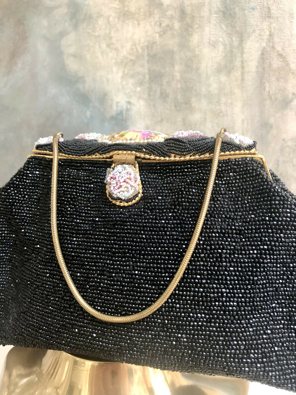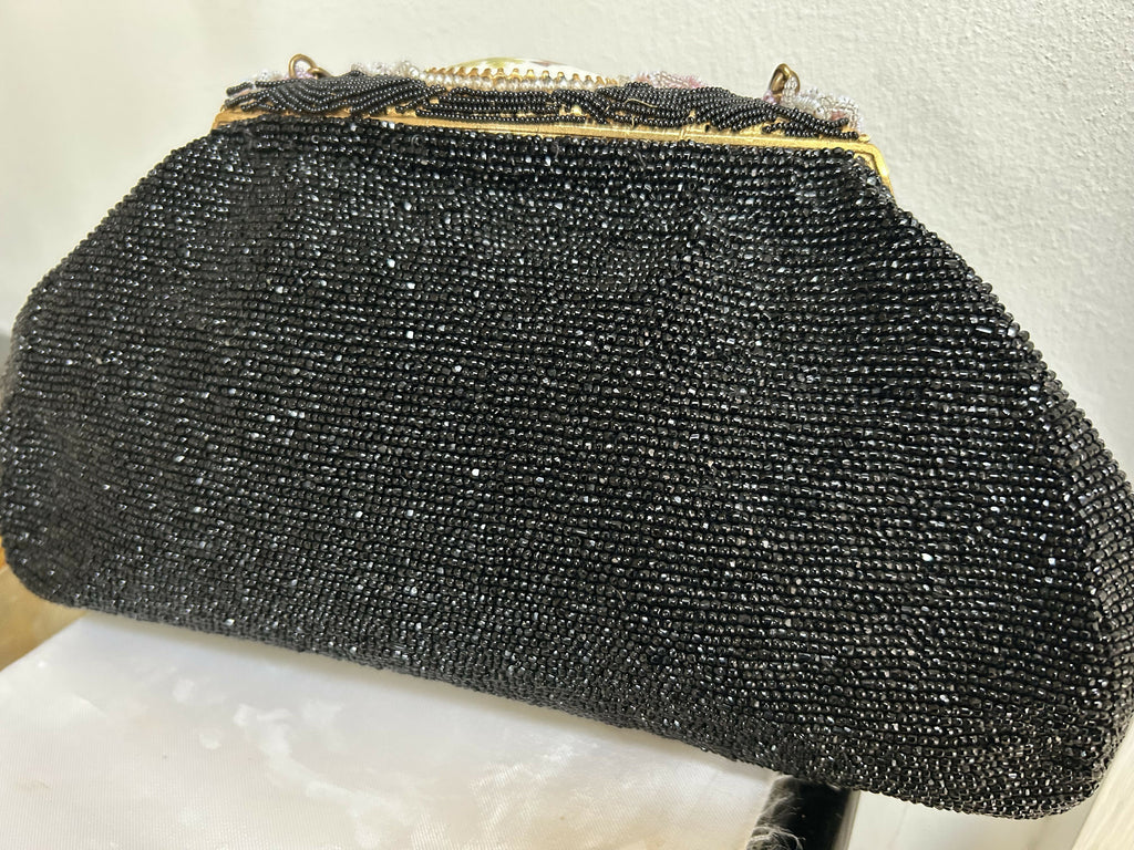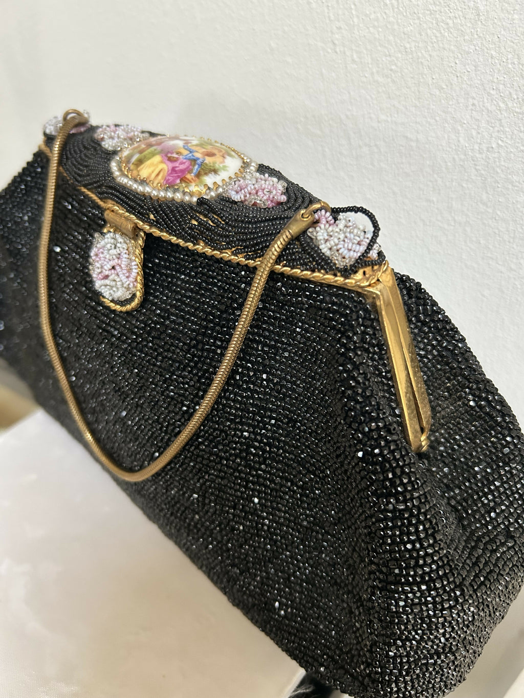 A rare and romantic 1930s–40s French evening bag, intricately decorated with thousands of tiny black, white, and pink hand-sewn glass beads. The design is elevated by a gilt frame set with a delicate Limoges porcelain plaque, beautifully surrounded by a border of faux pearls for an extra touch of refinement.