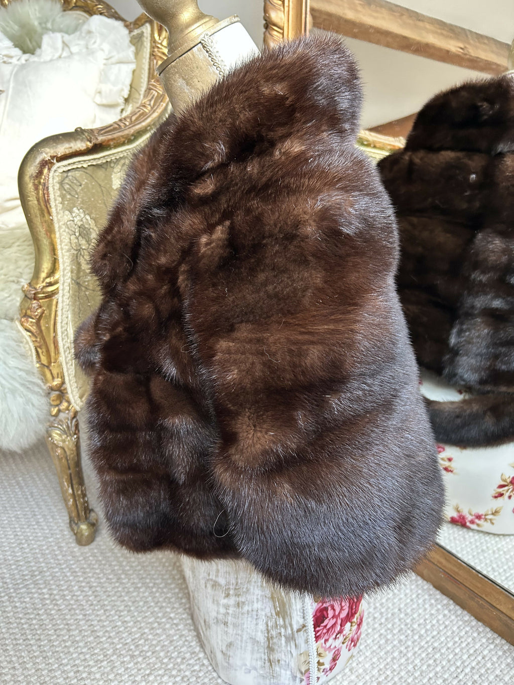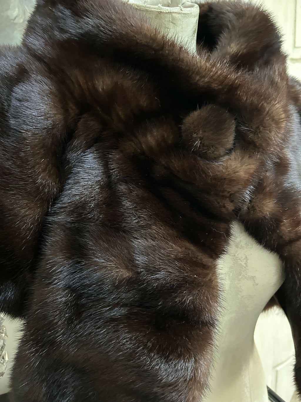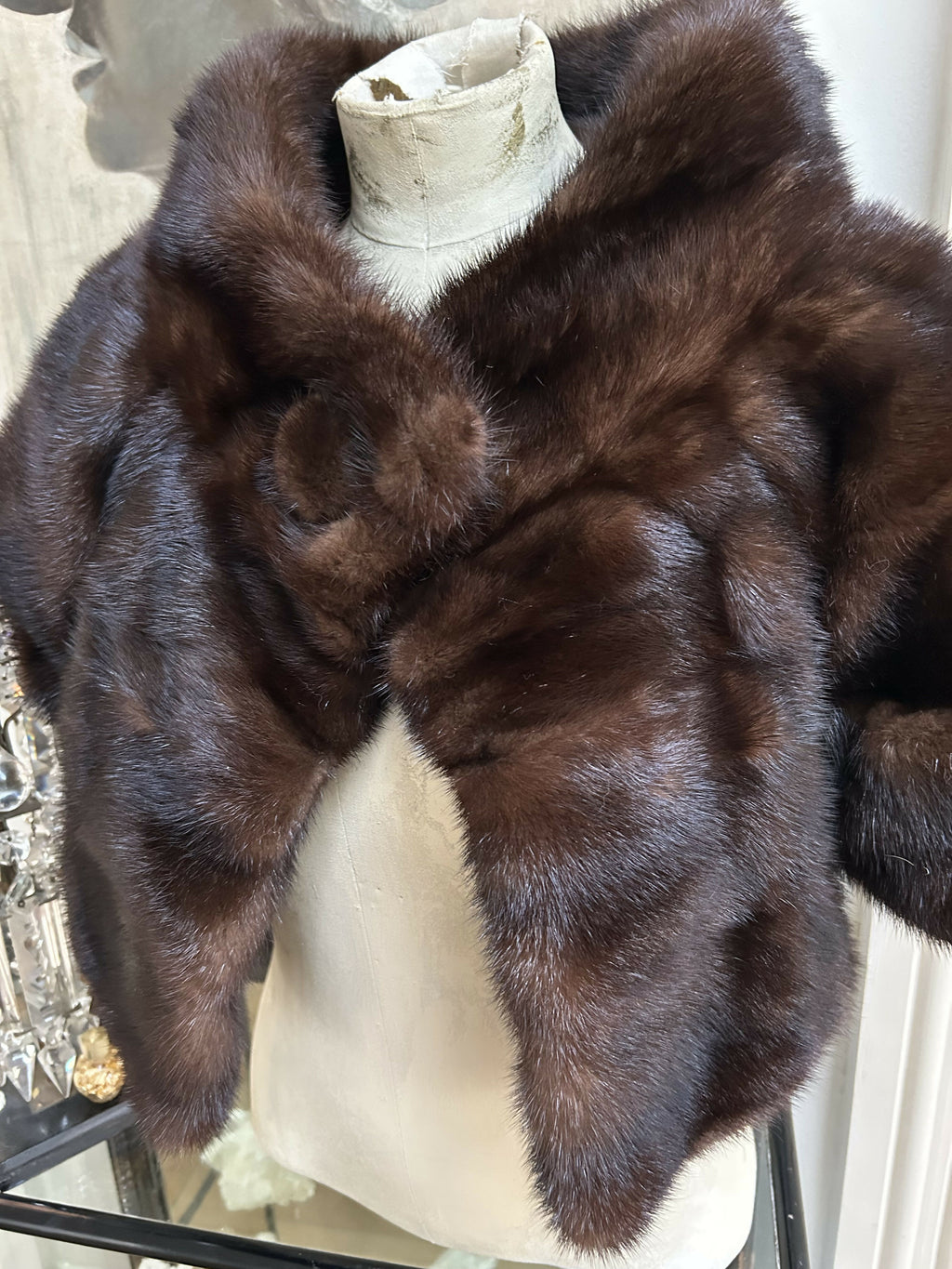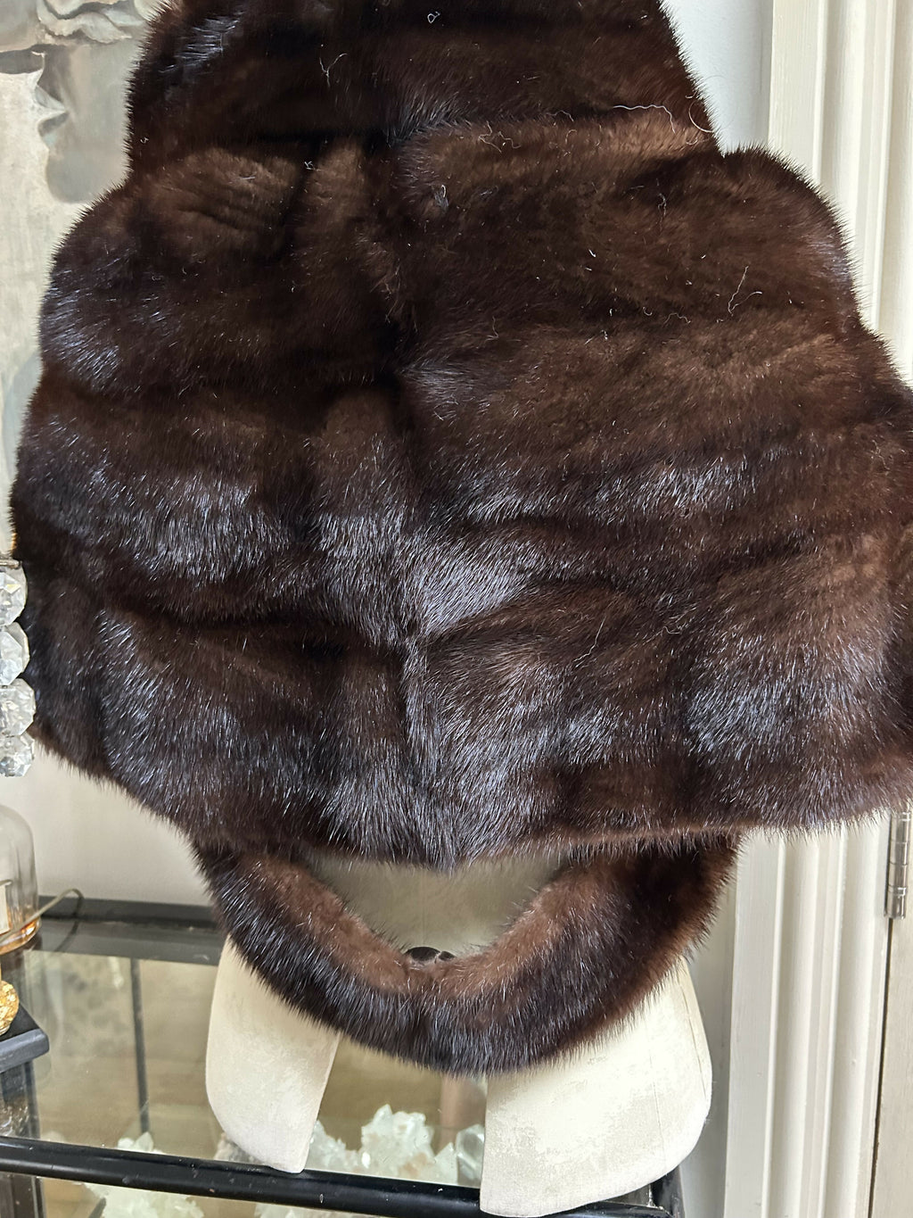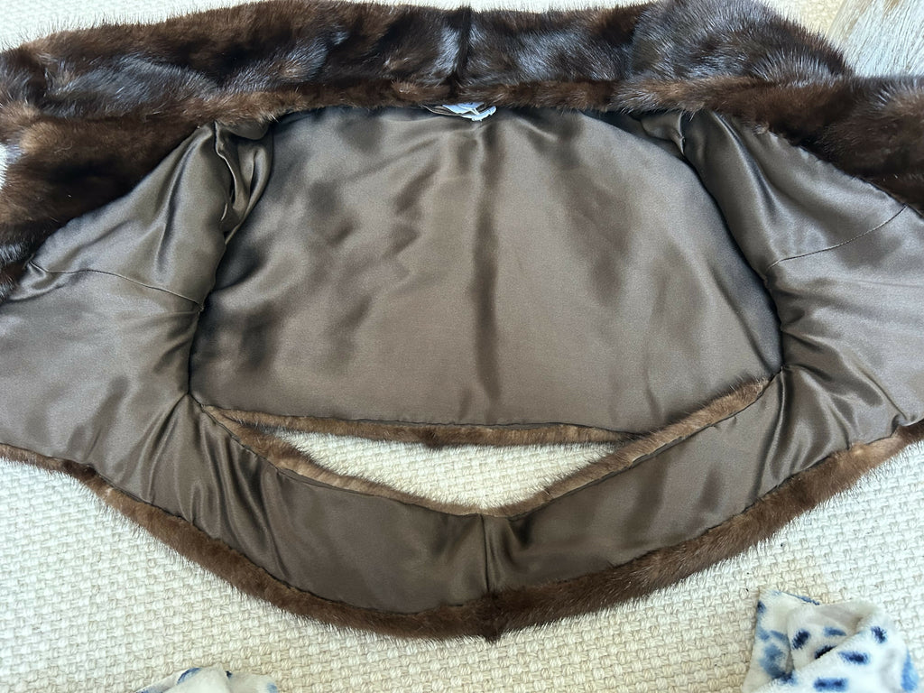 A beautifully luxurious vintage mink fur cape crafted in a rich chocolate-brown tone with an exceptionally soft, glossy handle. The fur is dense and well-matched, with a lovely natural sheen that catches the light beautifully.