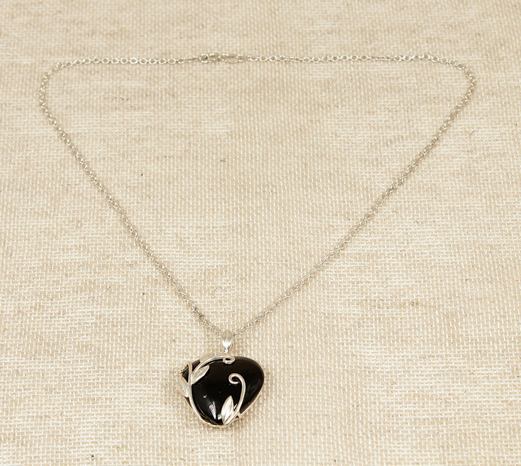 This stylish and pretty Silver and Onyx pendant is beautifully crafted in an Art Nouveau–inspired heart design. The hefty heart-shaped onyx forms the centrepiece, with flowing silver leaves and vine motifs entwined around the stone to create an elegant and organic mount.