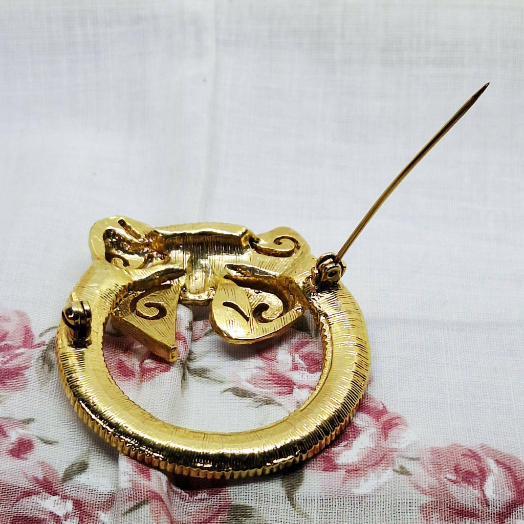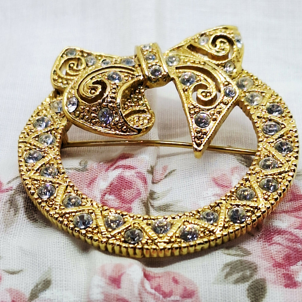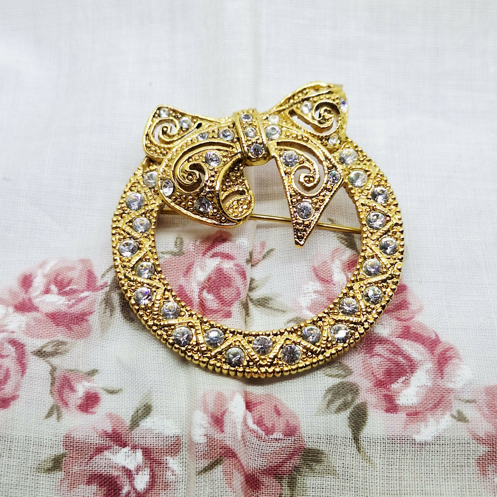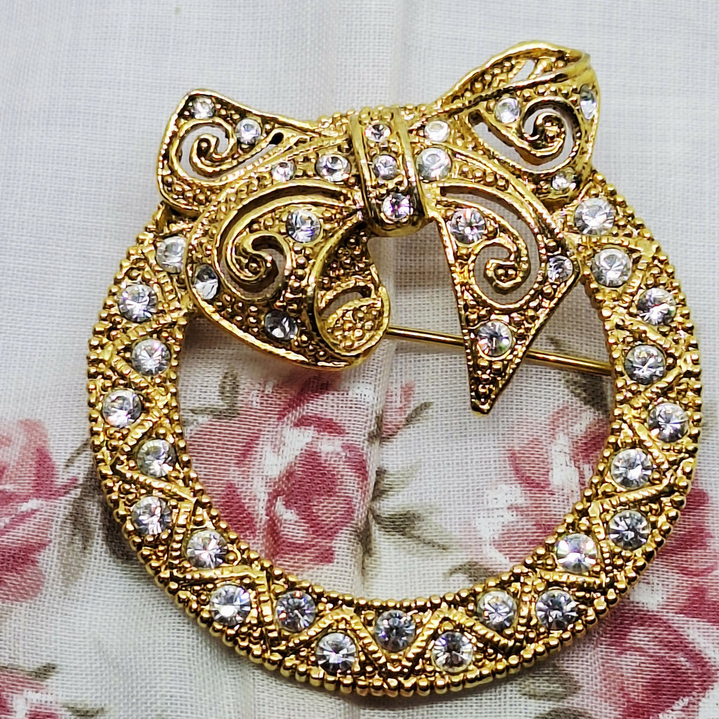 This is a beautiful vintage gold tone & faux diamond wreath bow brooch. Its design features a classic circular "textured wreath" base topped with a decorative bow, accented by clear rhinestones giving that sparkling diamond look.
