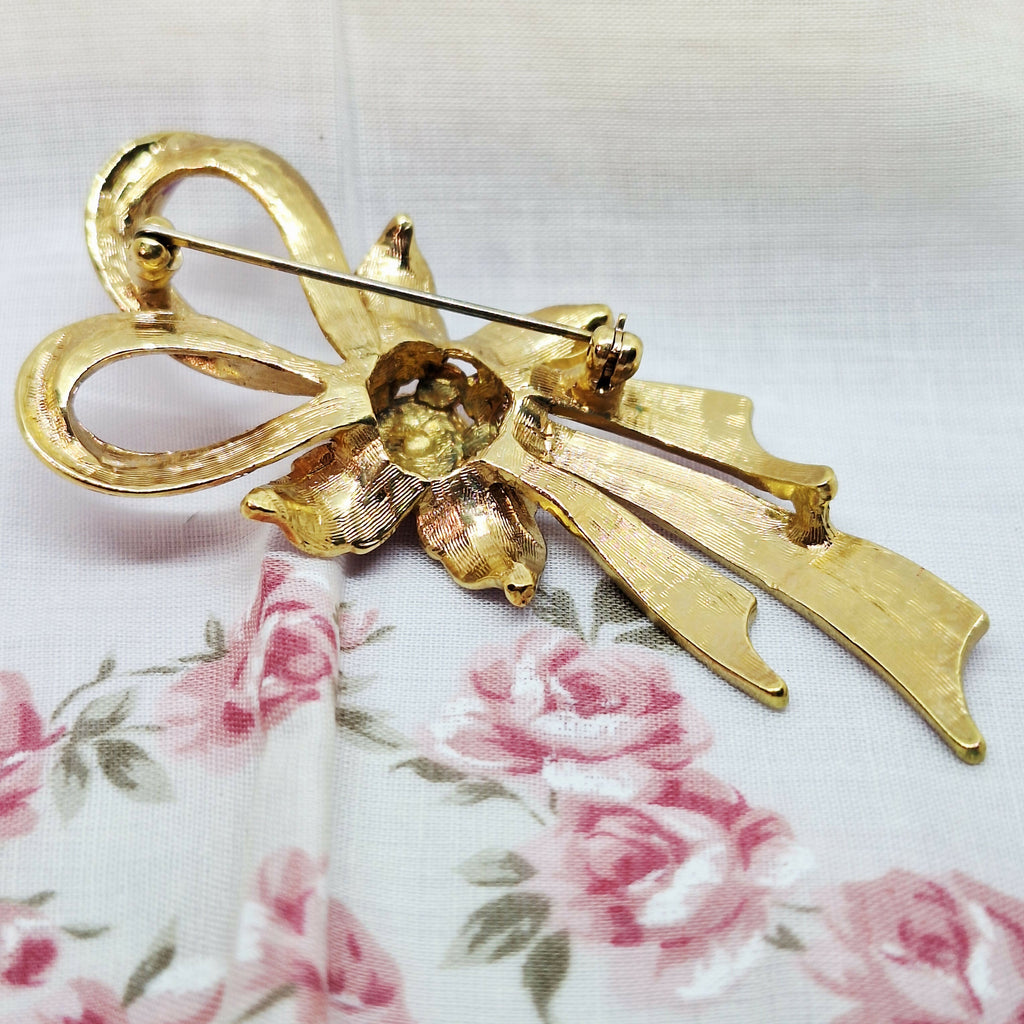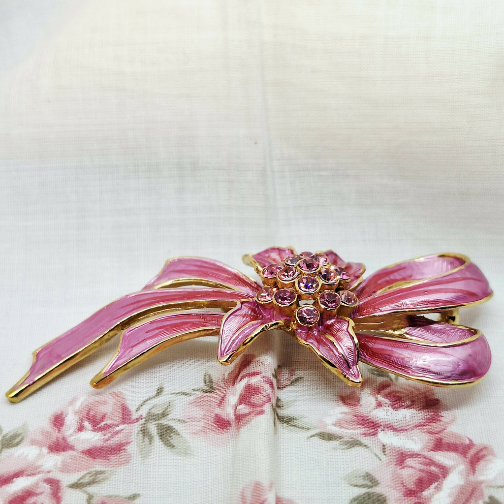 This is a wonderful vintage-style pink floral bow brooch. It combines a classic ribbon bow motif with a central flower. It has pink enamel work on the petals and ribbons within the gold-tone frame.The centre of the flower is clustered with small faux diamonds to give it some sparkle.