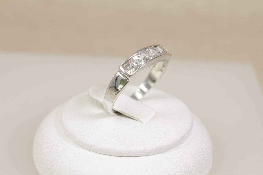 A beautifully crafted Sterling Silver ring featuring five princess-cut stones.