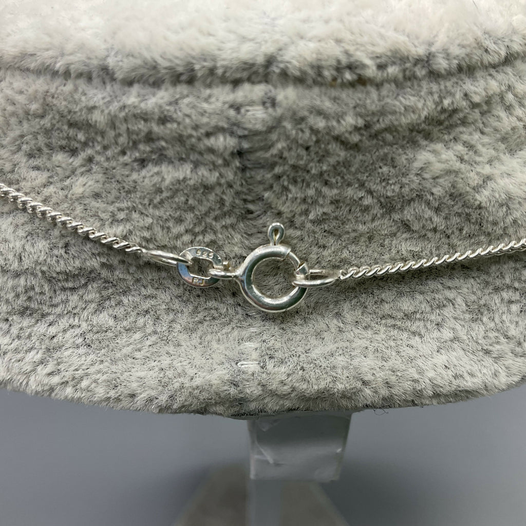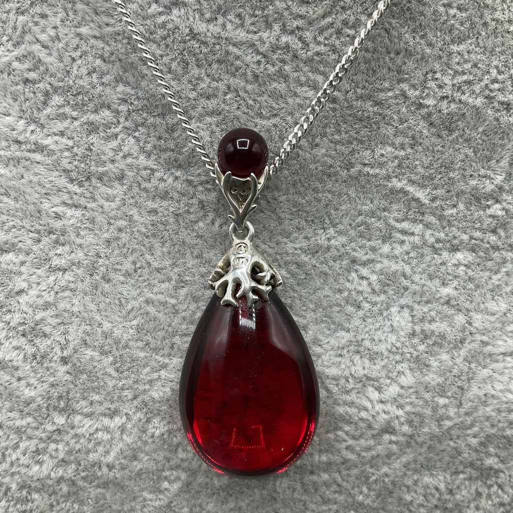 Sterling silver and red amber pendant, marked 925 with maker’s mark ‘G’ . With good quality flat link sterling silver chain, length 40.5cm, pendant 5cm